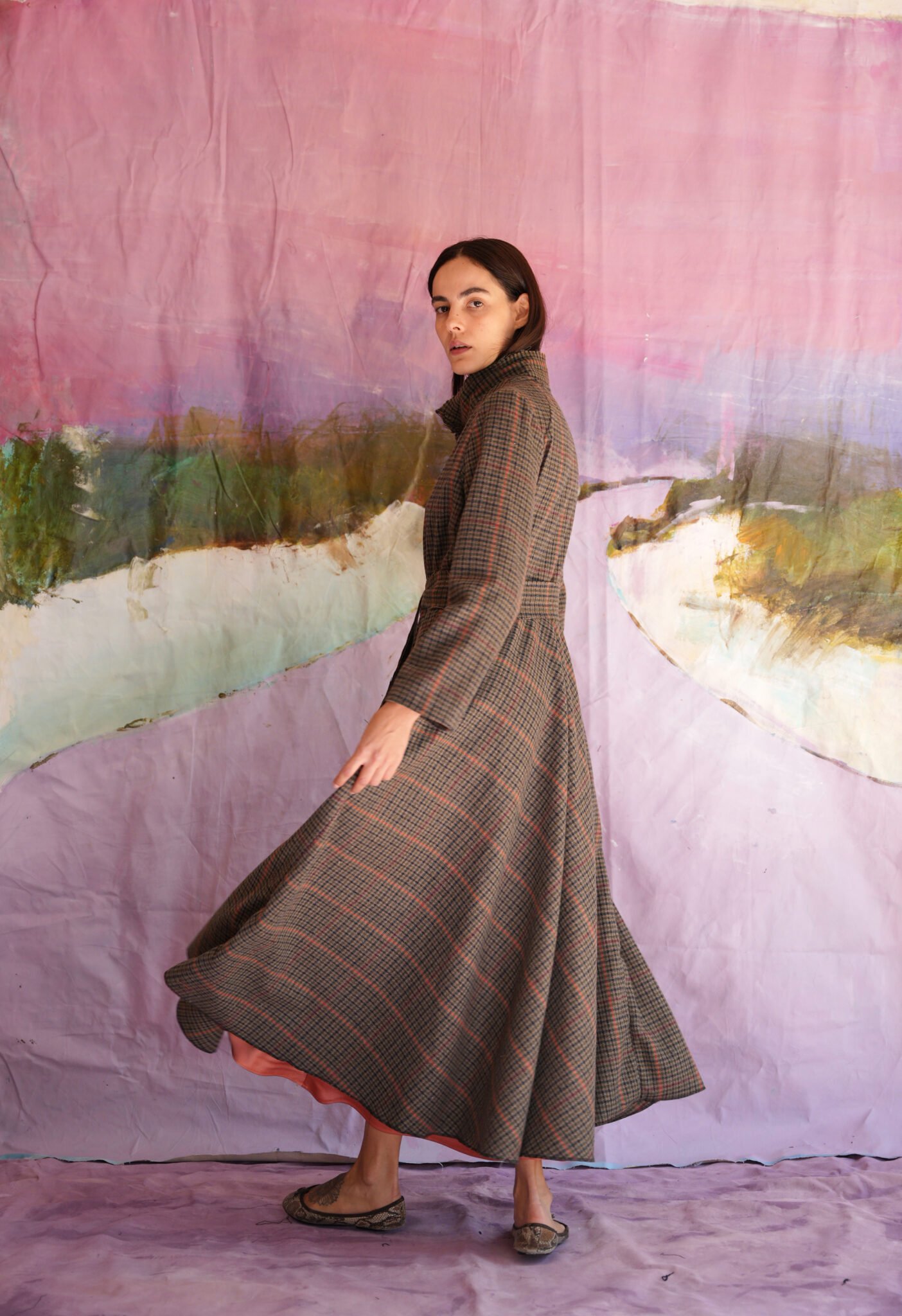 Checked robe coat with belted waist and buttons.