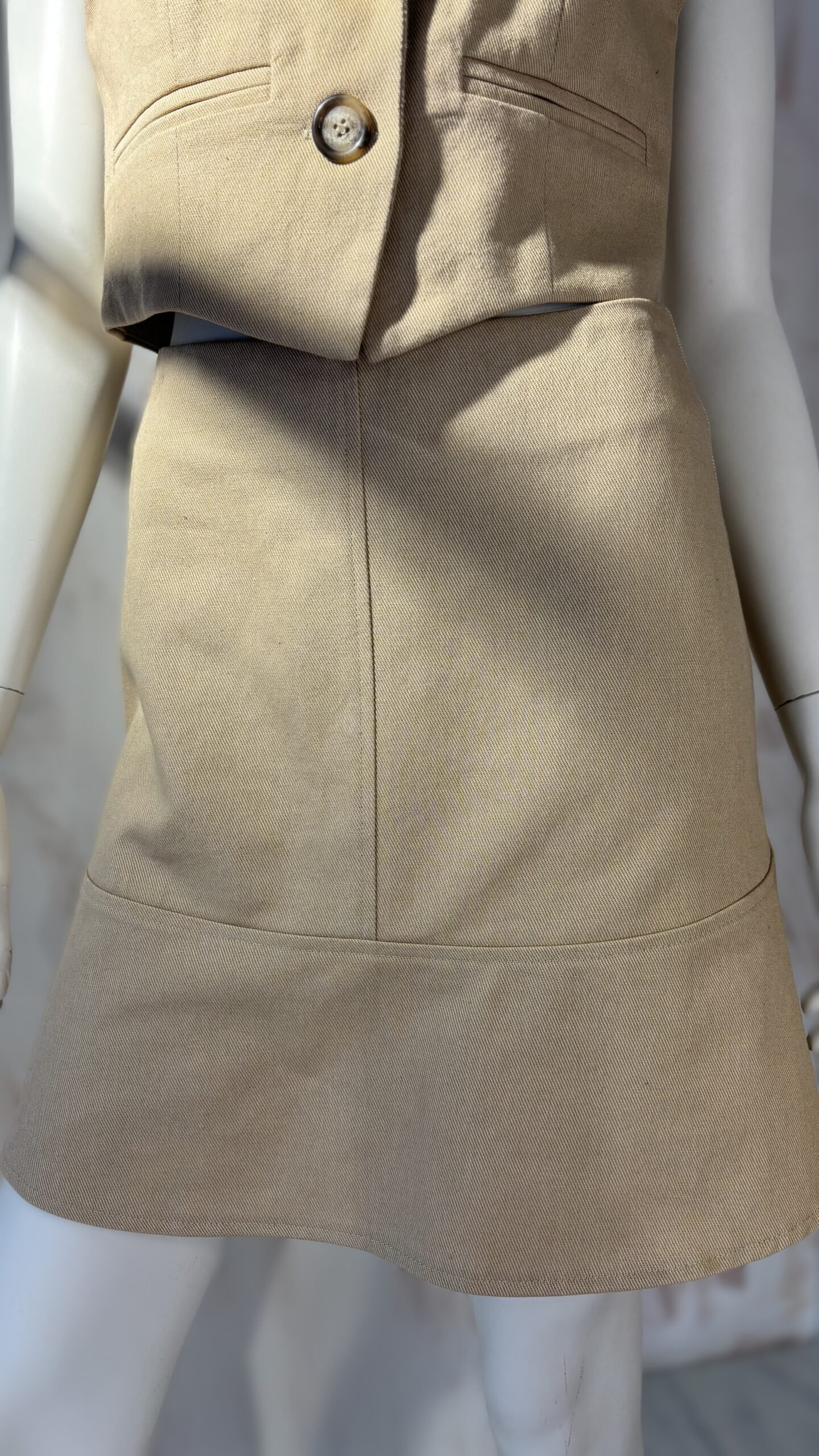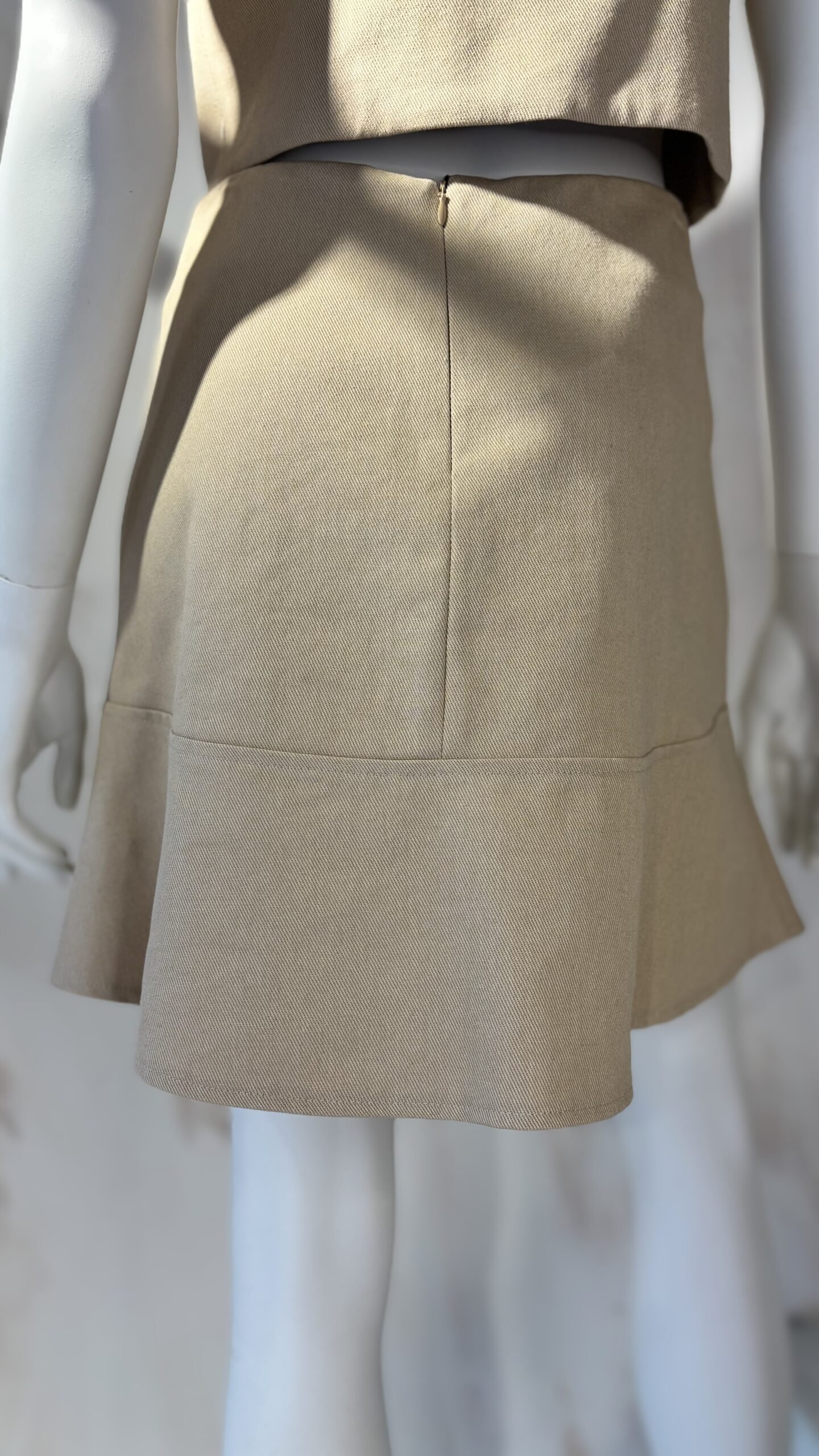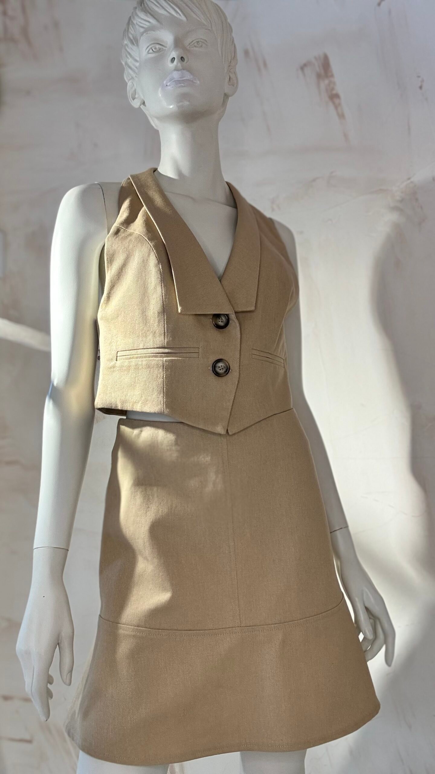 A modern ckontova mini skirt with a clean tailored feel and a softly flared hem. Designed to sit neatly on the waist, it features a flattering A-line silhouette with subtle seam detailing that creates structure while keeping the look minimal and refined. Wear it with the matching vest for a sharp co-ord set, or style it with a simple tank and sandals for effortless day-to-night dressing.