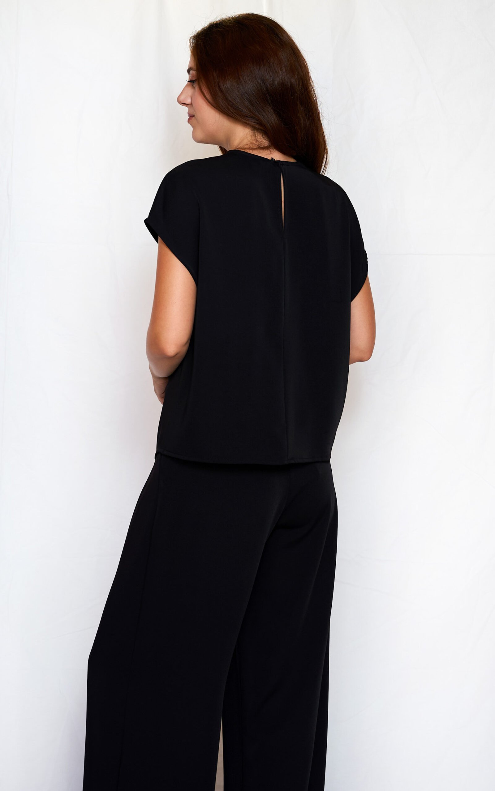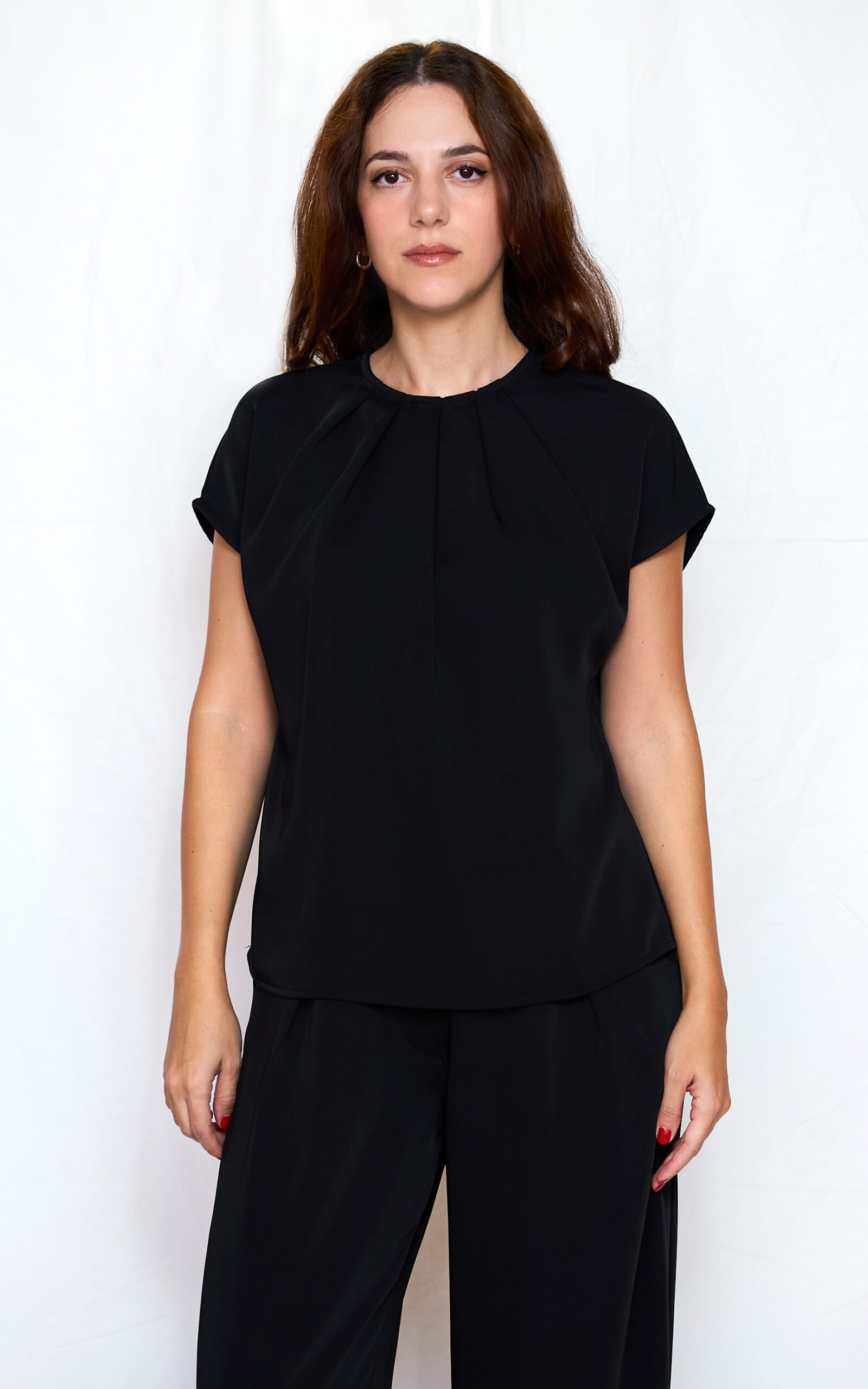 ckontova high-neck top with short sleeves featuring pleated details on its neckline