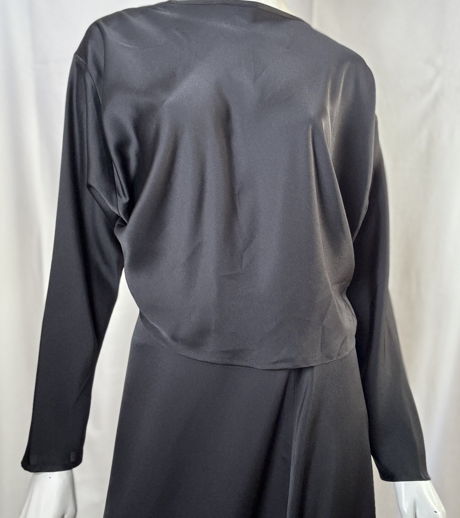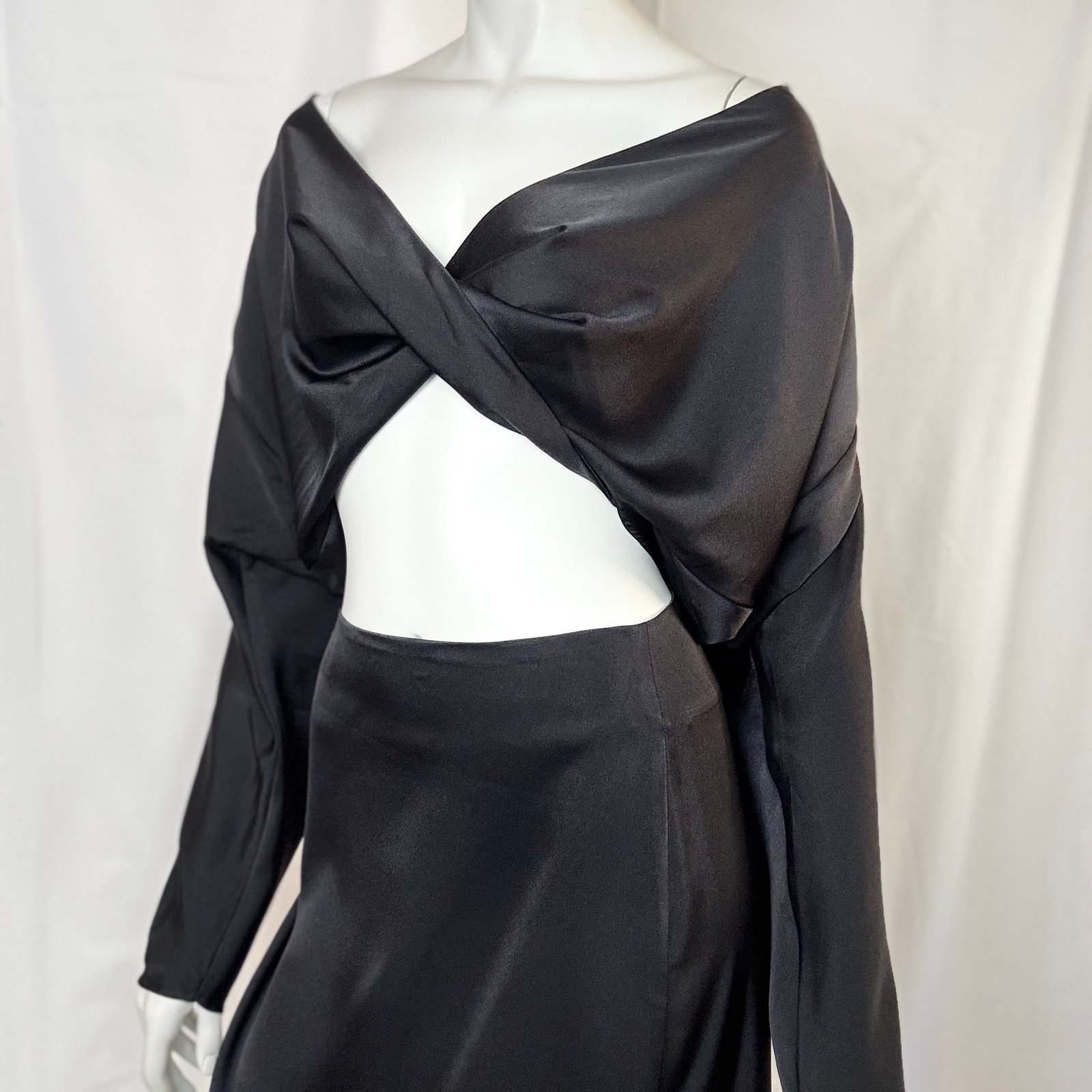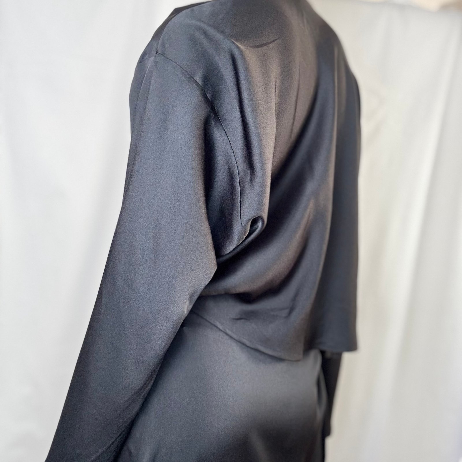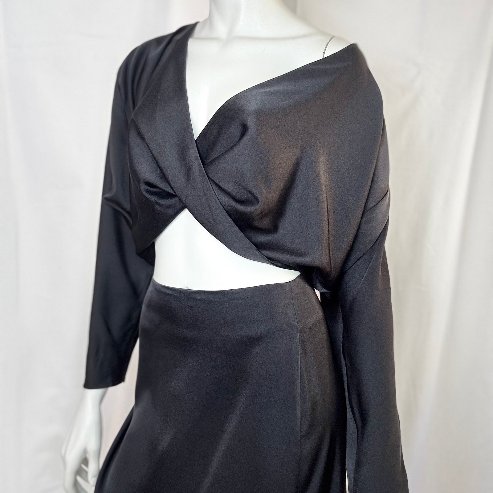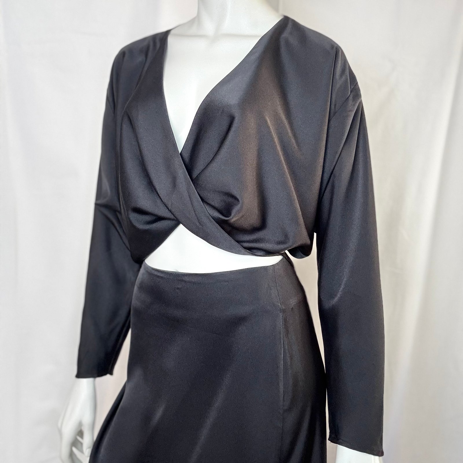 A statement wrap-style blouse by ckontova, designed with a deep V-neckline and a crossover front that reveals a subtle cut-out at the waist. Cut in a smooth satin-like fabric with a fluid drape, it features relaxed long sleeves and a softly cropped silhouette that pairs perfectly with high-waisted bottoms. Wear it with the matching skirt/shorts for a polished occasion set, or style with tailored trousers for elevated nights out.