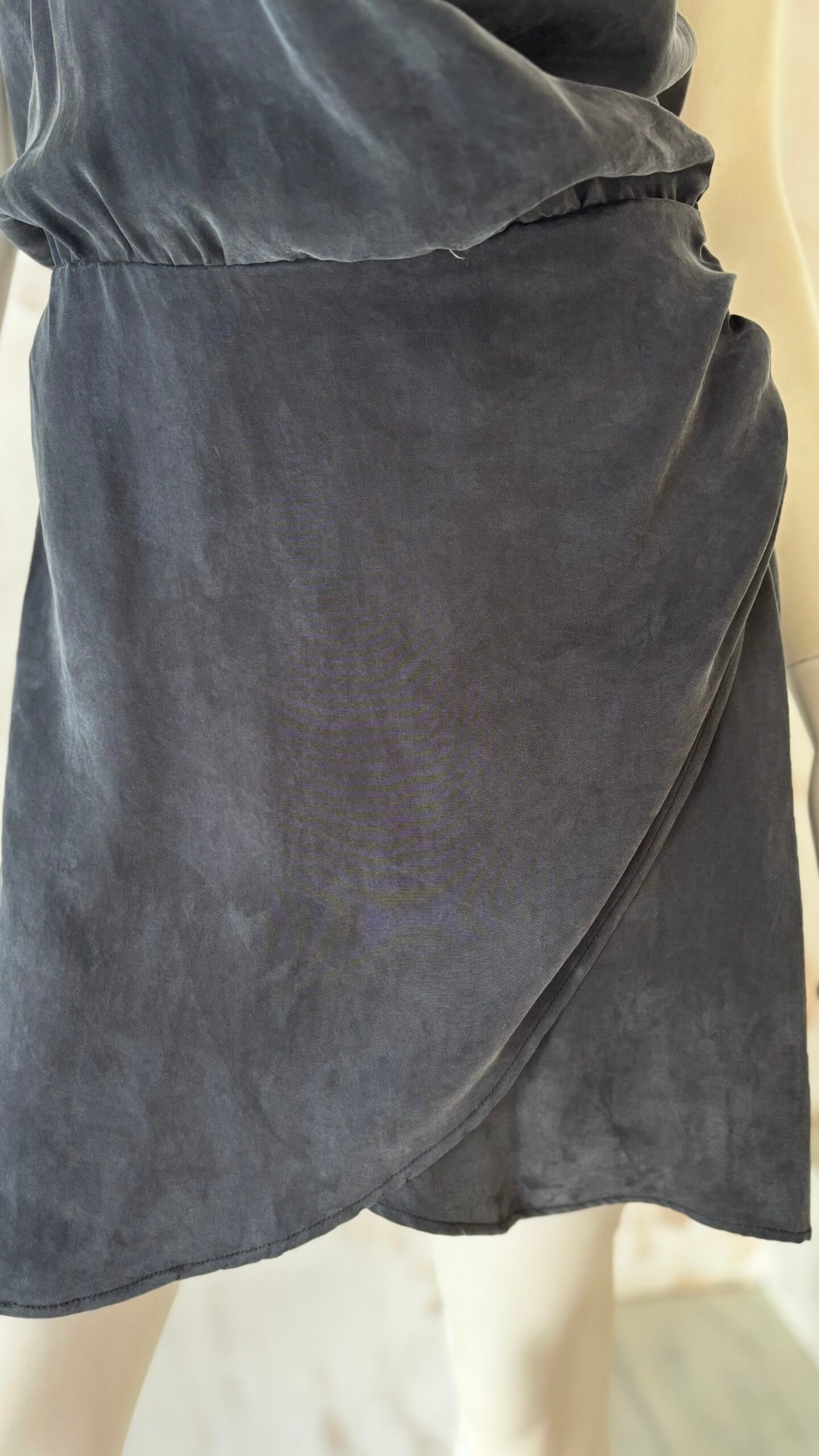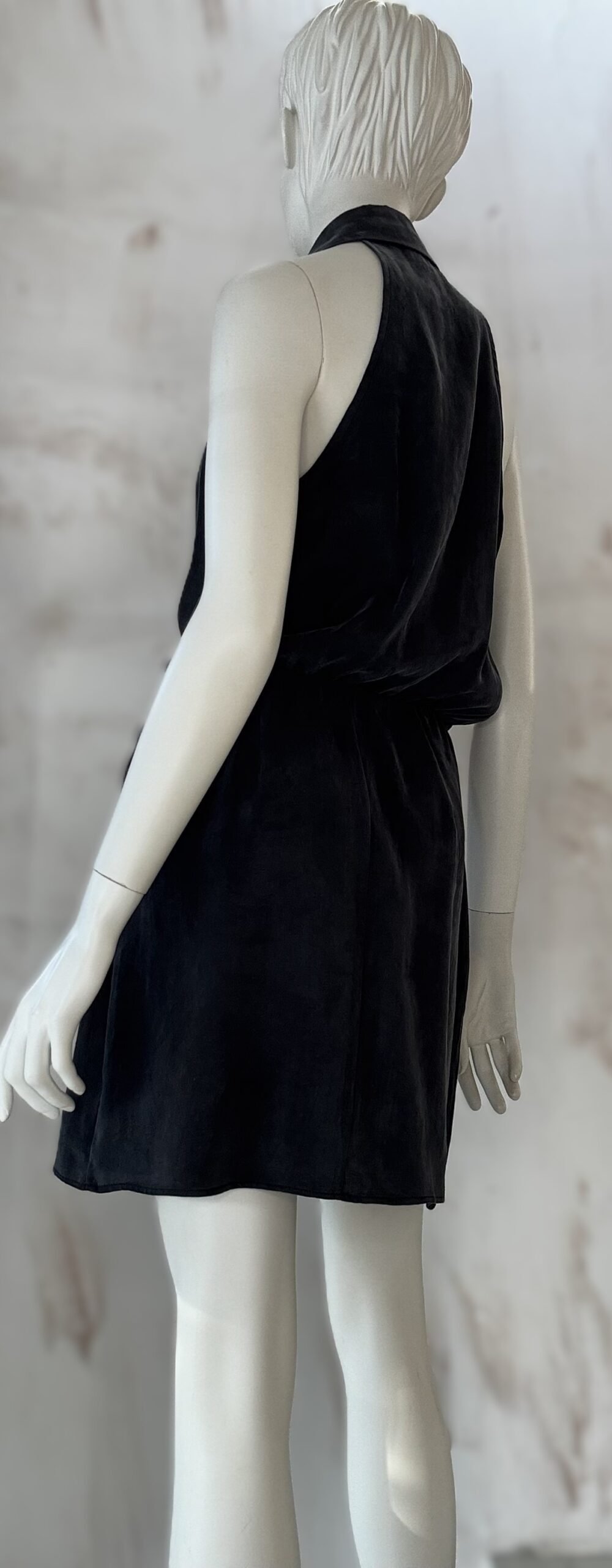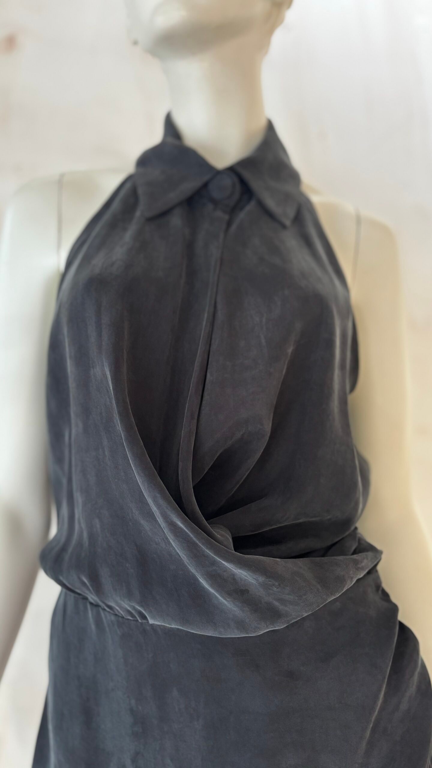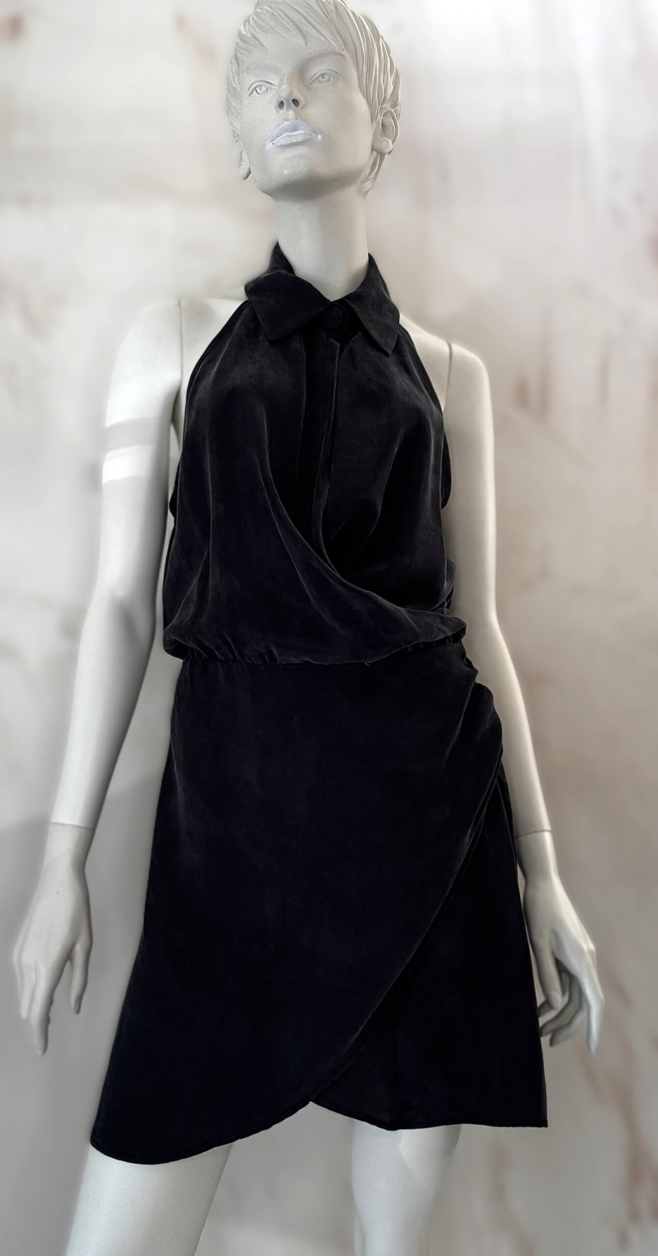 A sleek ckontova mini dress designed with a modern halter silhouette and soft draping for an effortlessly refined look. Featuring a sharp collar detail and a fluid crossover front, it falls into an asymmetric wrap-style skirt with gentle ruching at the side for a flattering fit. Cut in a lightweight fabric with a soft, matte finish, it’s perfect for warm-weather evenings, summer parties, and elevated resort styling.