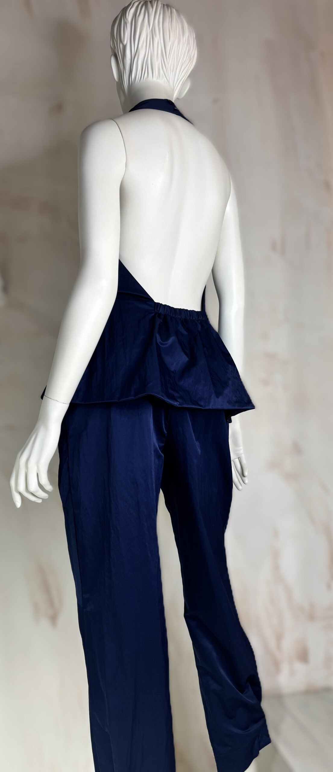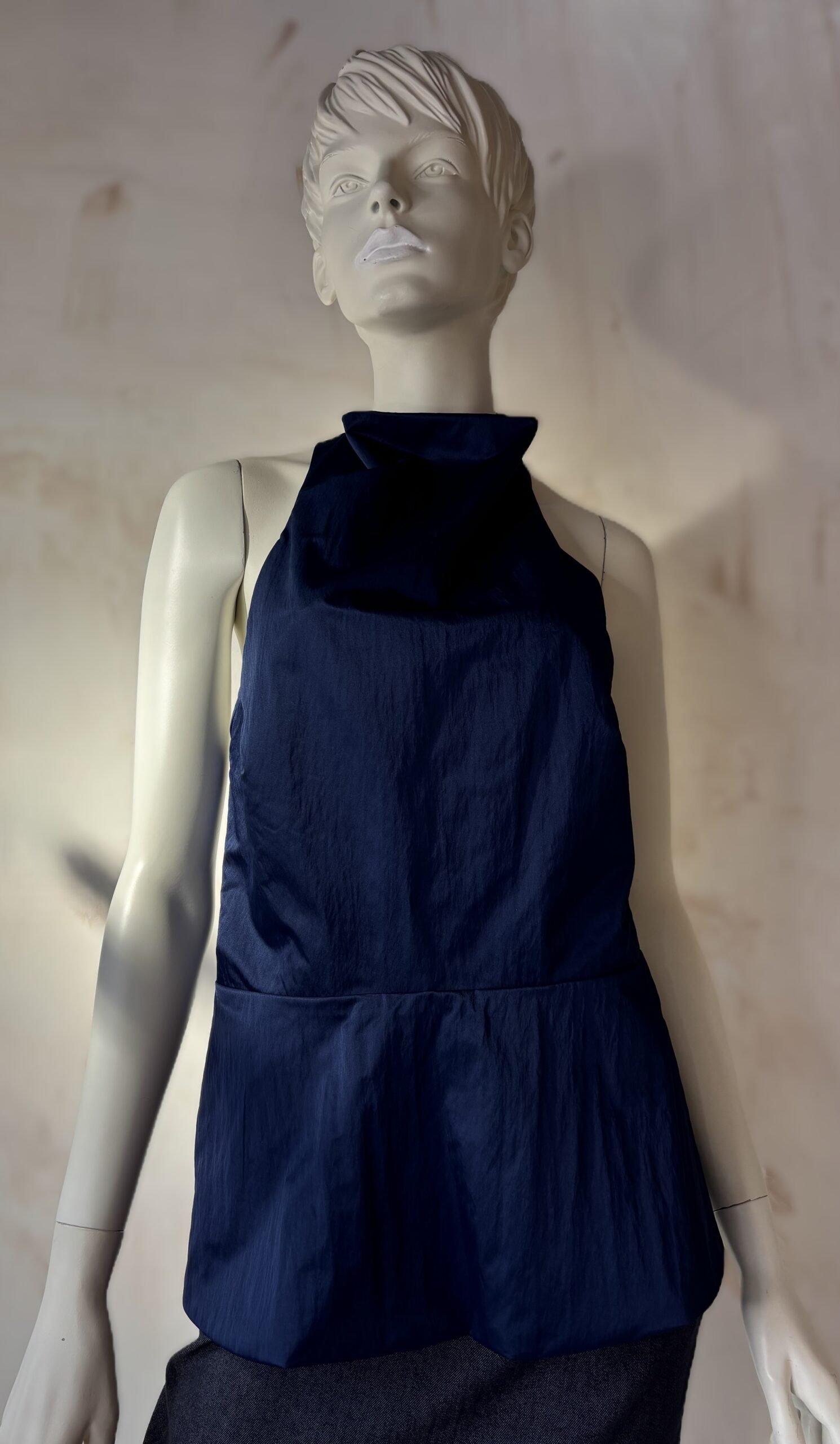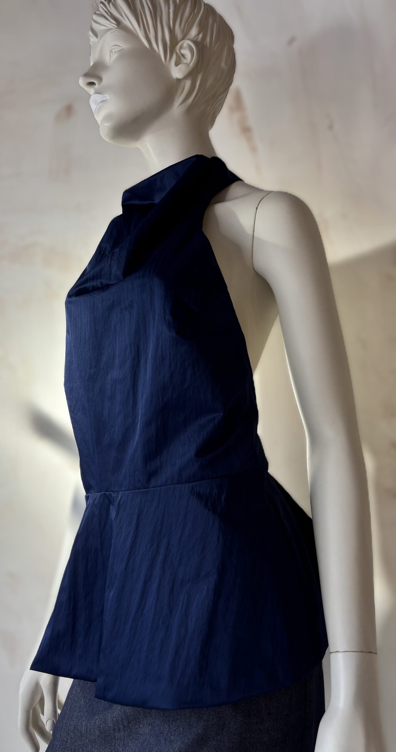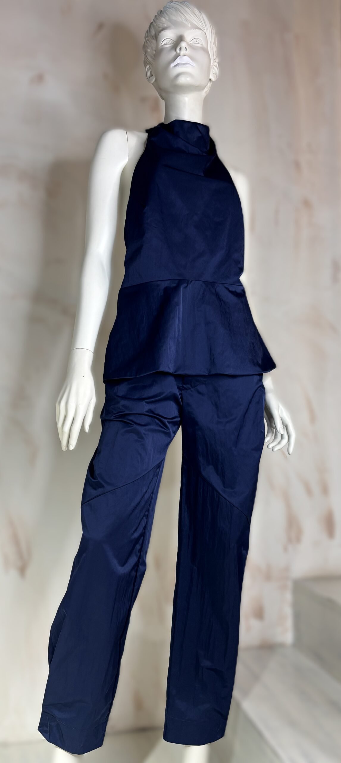 A sleek ckontova halter top designed with clean lines and an elevated, minimal feel. Featuring a high neckline with soft draping, it’s cut in a structured yet lightweight fabric that holds its shape while moving comfortably. The silhouette falls straight with a subtle peplum-like finish at the hem, making it perfect for refined day-to-night styling. Wear it with the matching trousers for a modern set, or pair it with a tailored skirt for understated evening polish.