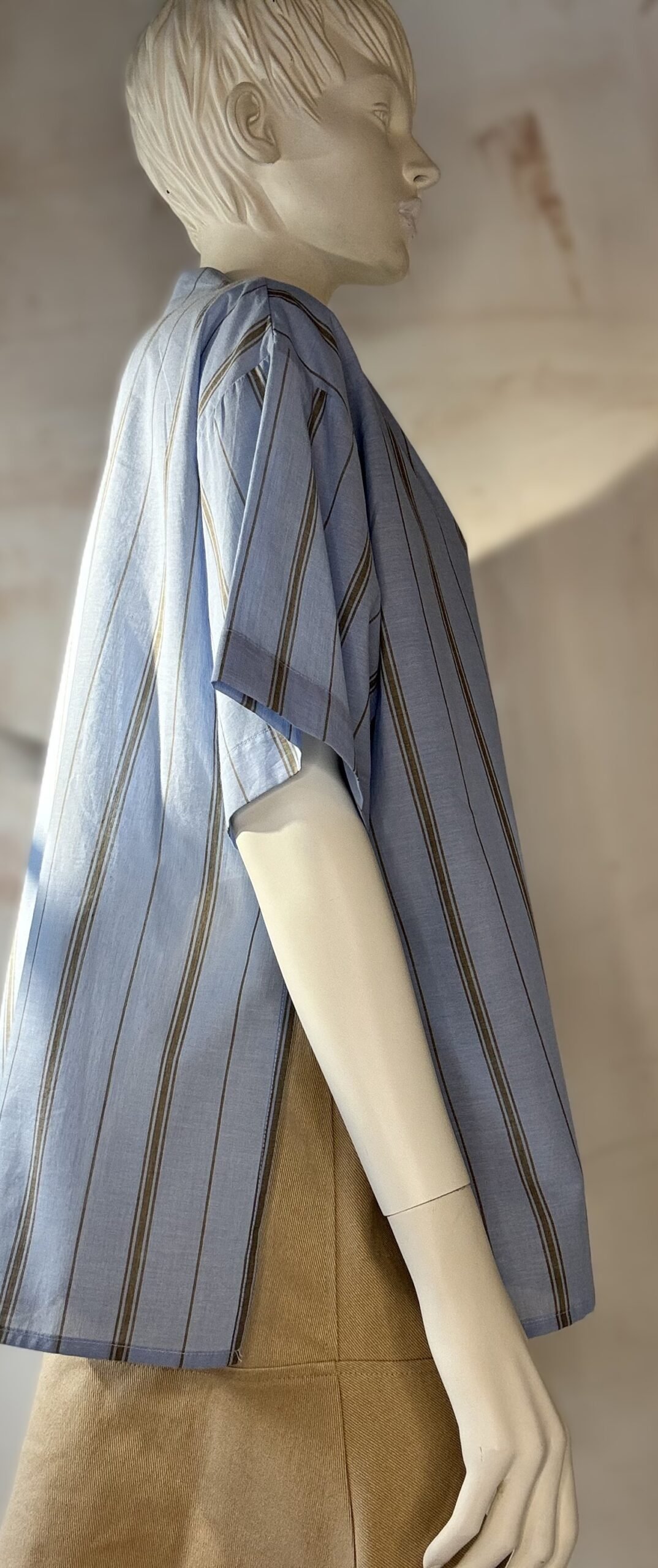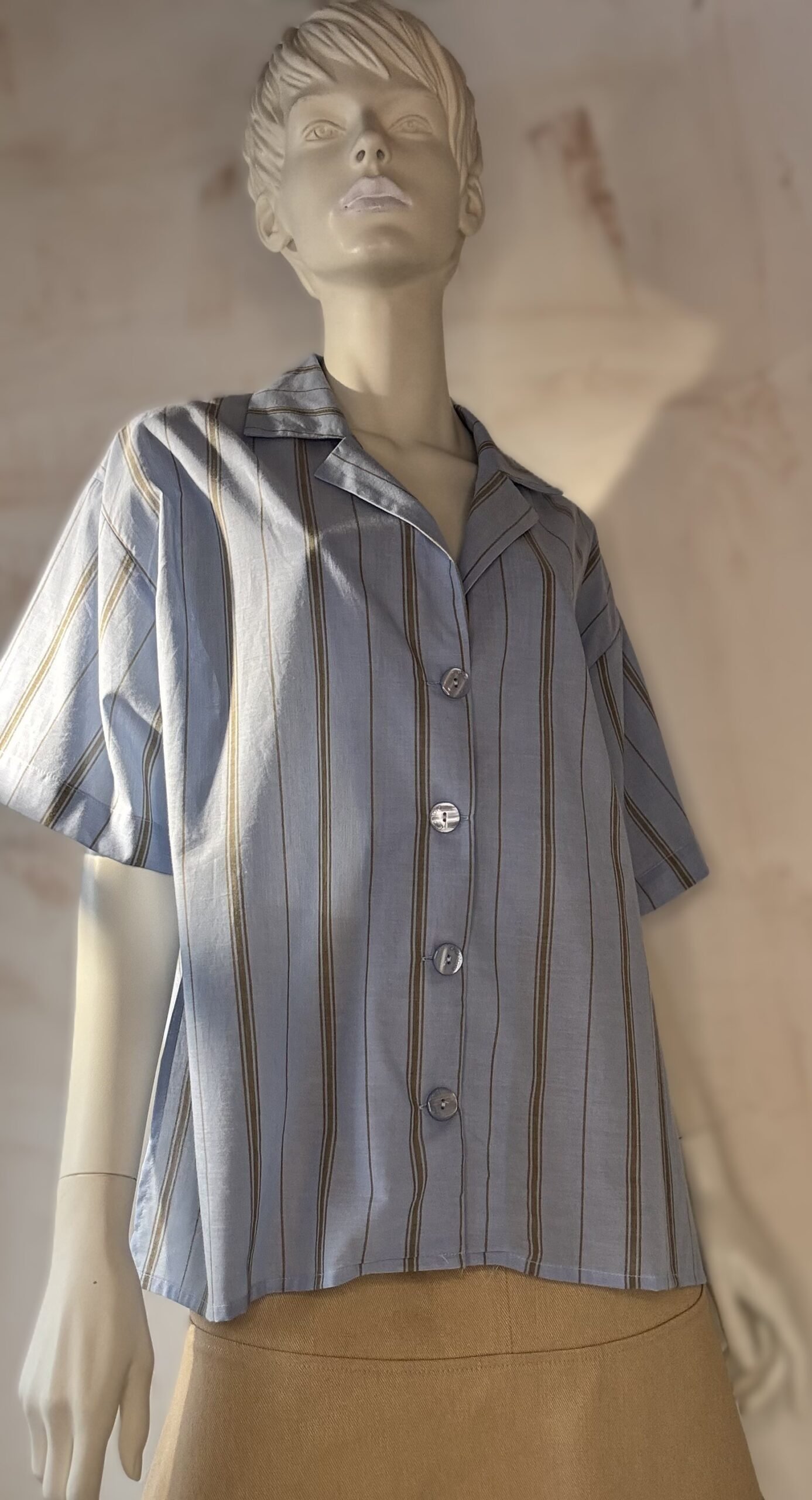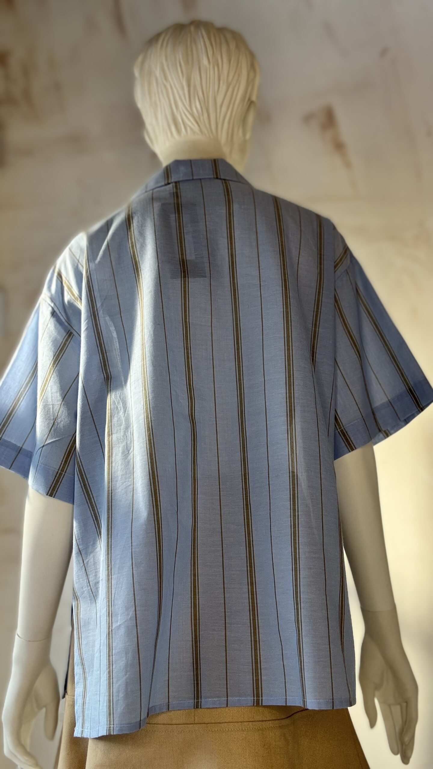 A fresh take on a classic by ckontova, this striped short-sleeve shirt is designed in a relaxed silhouette with a soft camp-style collar and a button-down front. The light blue base is accented with vertical contrast stripes for an easy, summer-ready look that still feels polished. Style it with tailored trousers for effortless city dressing, or wear it open over a tank for laid-back vacation vibes.