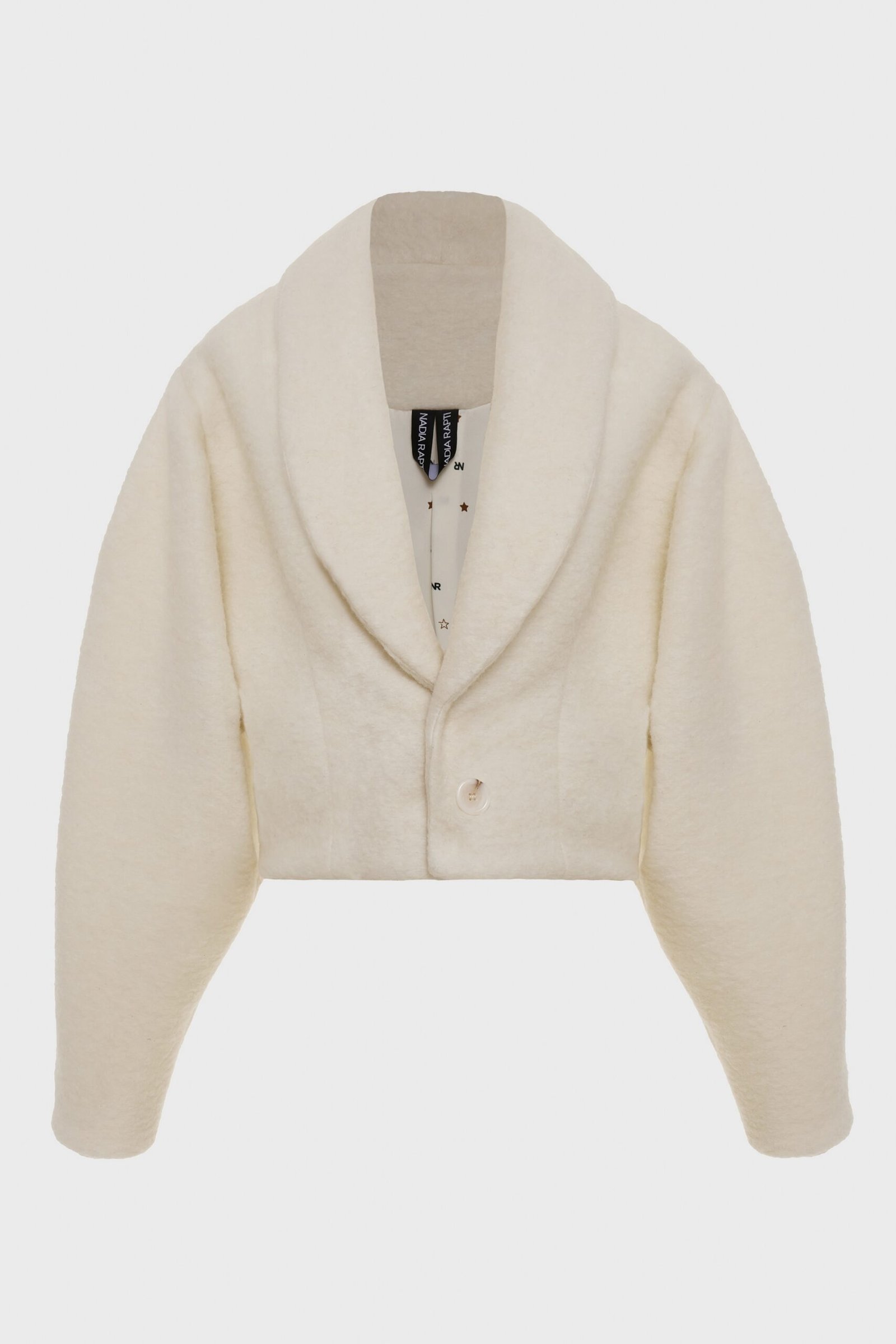 A cozy, minimal cropped jacket crafted from boiled wool, designed for clean and contemporary lines. Its relaxed fit, soft shoulders, and cropped silhouette create an elegant and feminine look, perfect for effortless everyday layering.