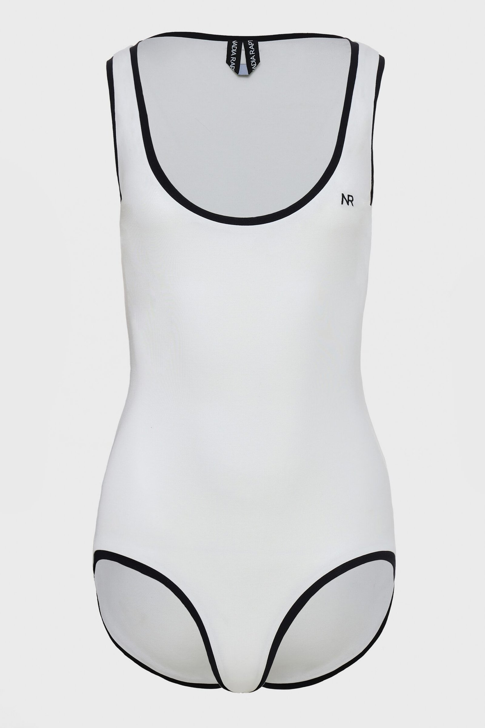 A sleeveless bodysuit with a contrast trim and scoop neckline, designed to hug the body with a flattering fit. Made from soft jersey fabric that moves comfortably with you. Features a small NR logo on the front. Available in black with white trim and white with black trim.