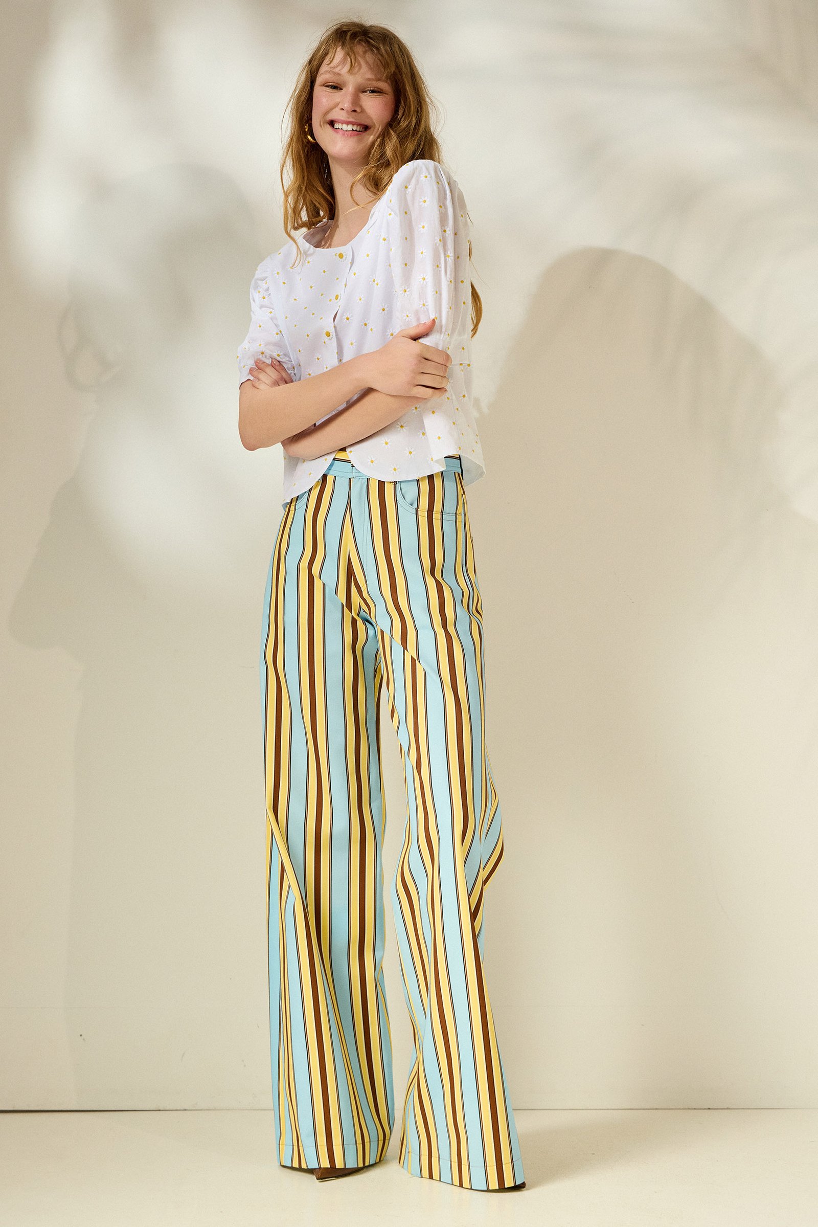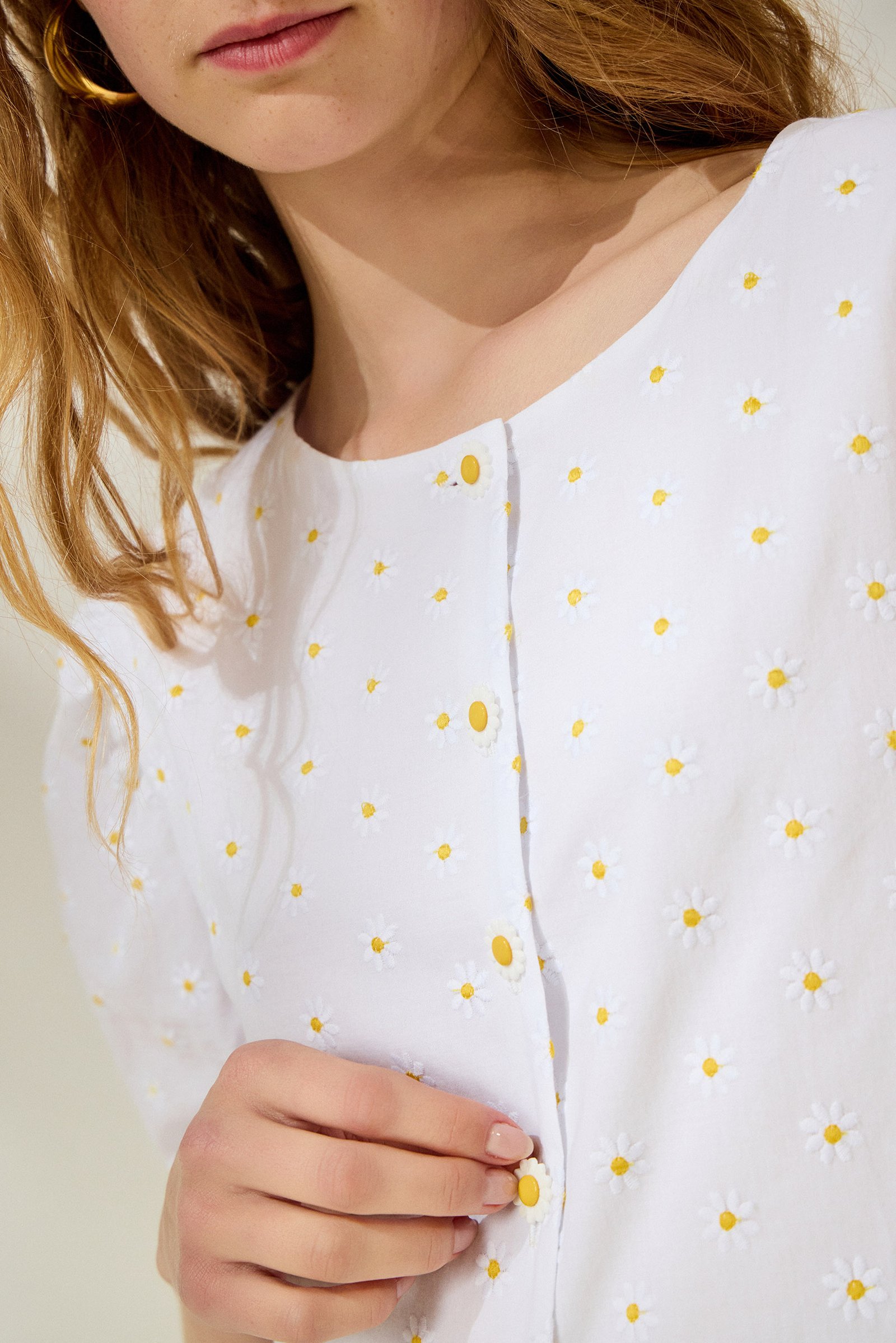 Ρομαντικό, βαμβακερό πουκάμισο αποπνέει φρεσκάδα και θηλυκότητα. Οι κεντημένες μαργαρίτες σε συνδυασμό με τα ιδιαίτερα κουμπιά-μαργαρίτες δημιουργούν ένα παιχνιδιάρικο αλλά κομψό αποτέλεσμα, ενώ τα φουσκωτά μανίκια προσθέτουν όγκο και μοντέρνο χαρακτήρα.