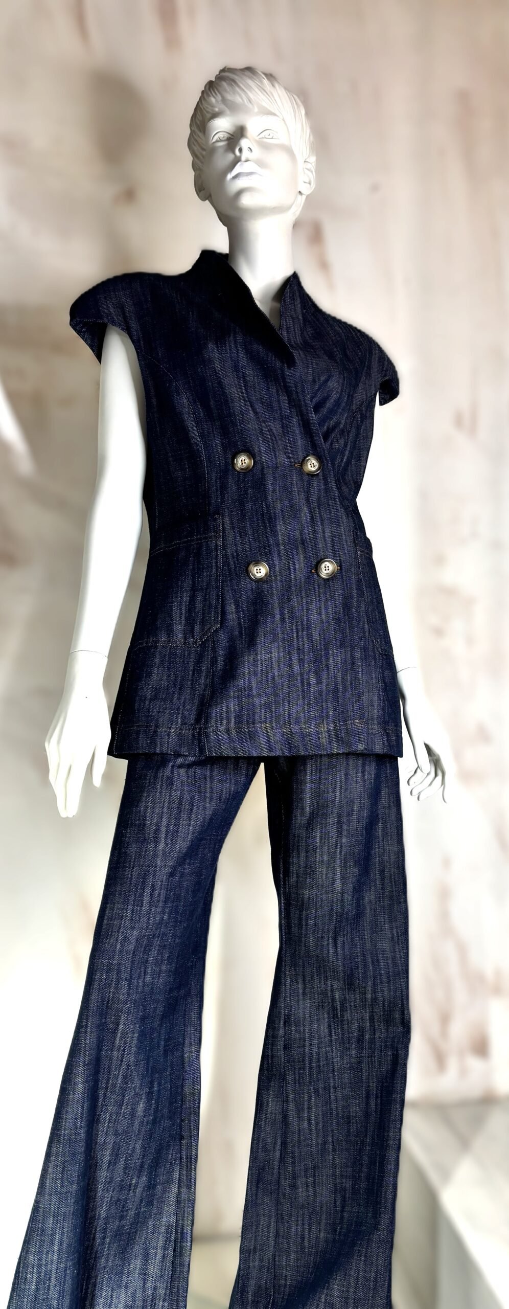 A modern tailoring essential by ckontova, these denim-look pants are cut in a fluid wide-leg silhouette that creates an elongated, flattering line. Designed to sit comfortably on the waist, they feature a clean finish and subtle structure that balances ease with polish. Wear them with the matching sleeveless blazer for a strong contemporary set, or style with a simple tank and sandals for effortless city dressing.