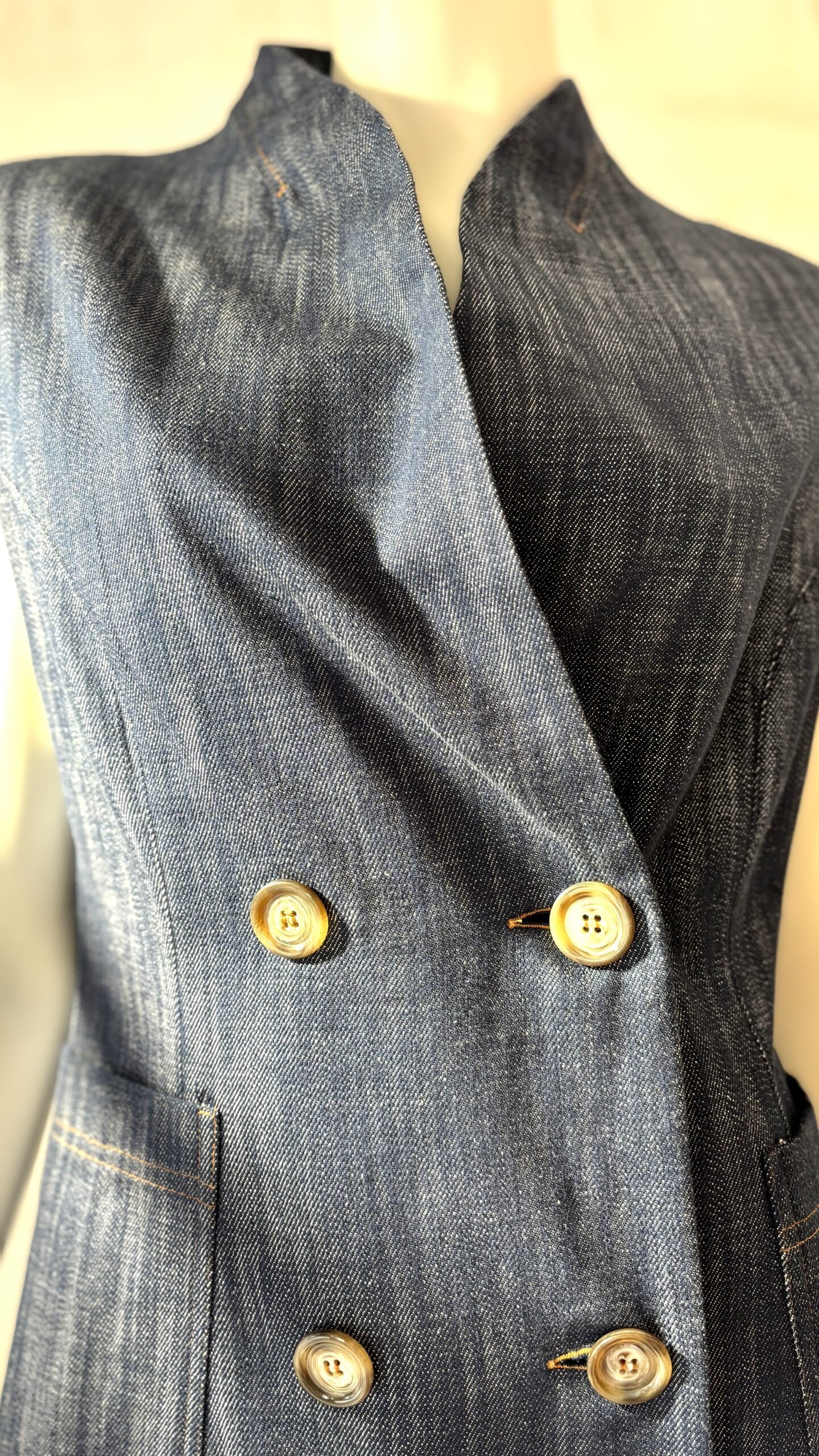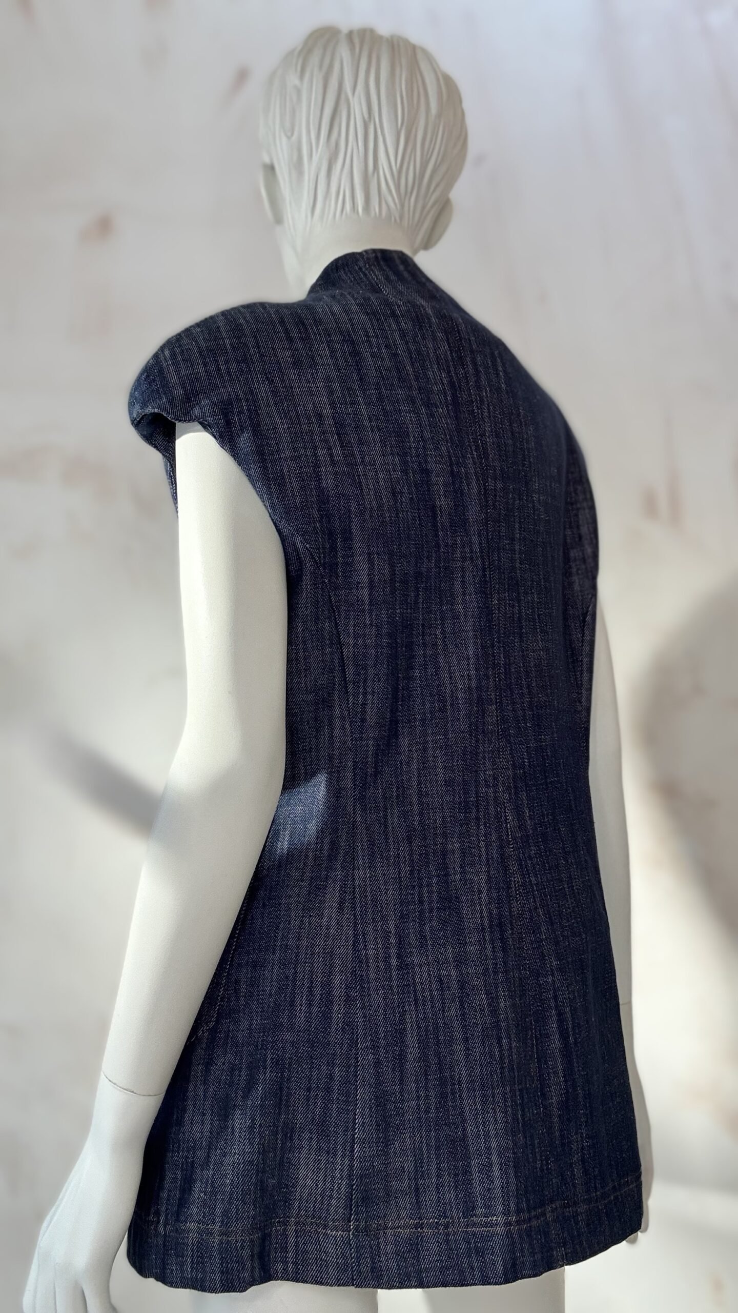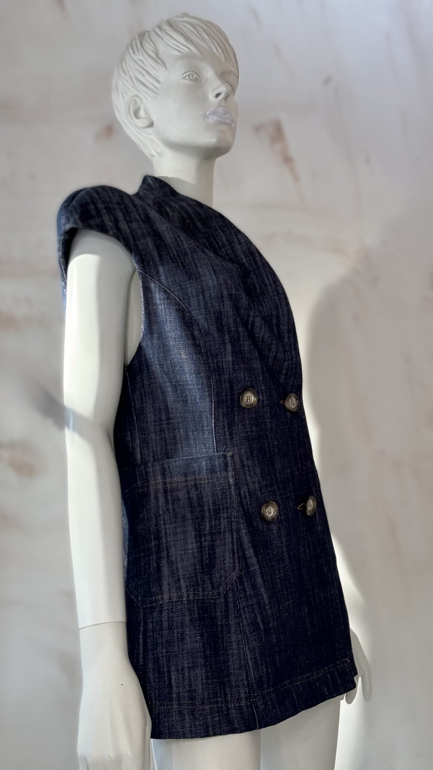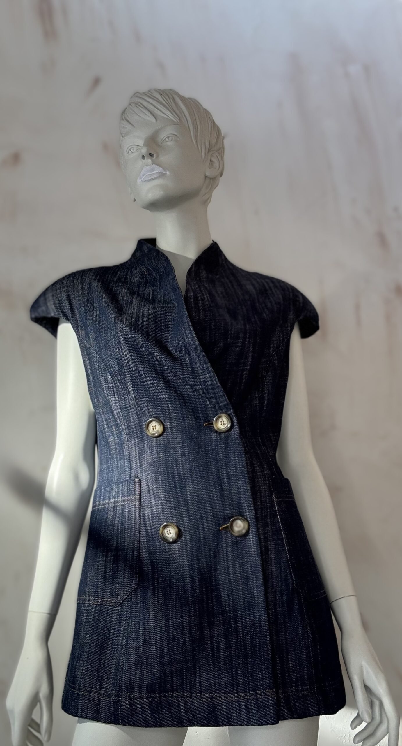 A sharp, tailored statement by ckontova, this sleeveless denim blazer is cut in a structured silhouette with defined shoulders and a double-breasted front. Featuring a clean lapel collar, contrast topstitching, and oversized patch pockets, it balances power tailoring with warm-weather ease. Wear it as a top with the matching pants for a modern set, or layer it over a tank or shirt for elevated city styling.