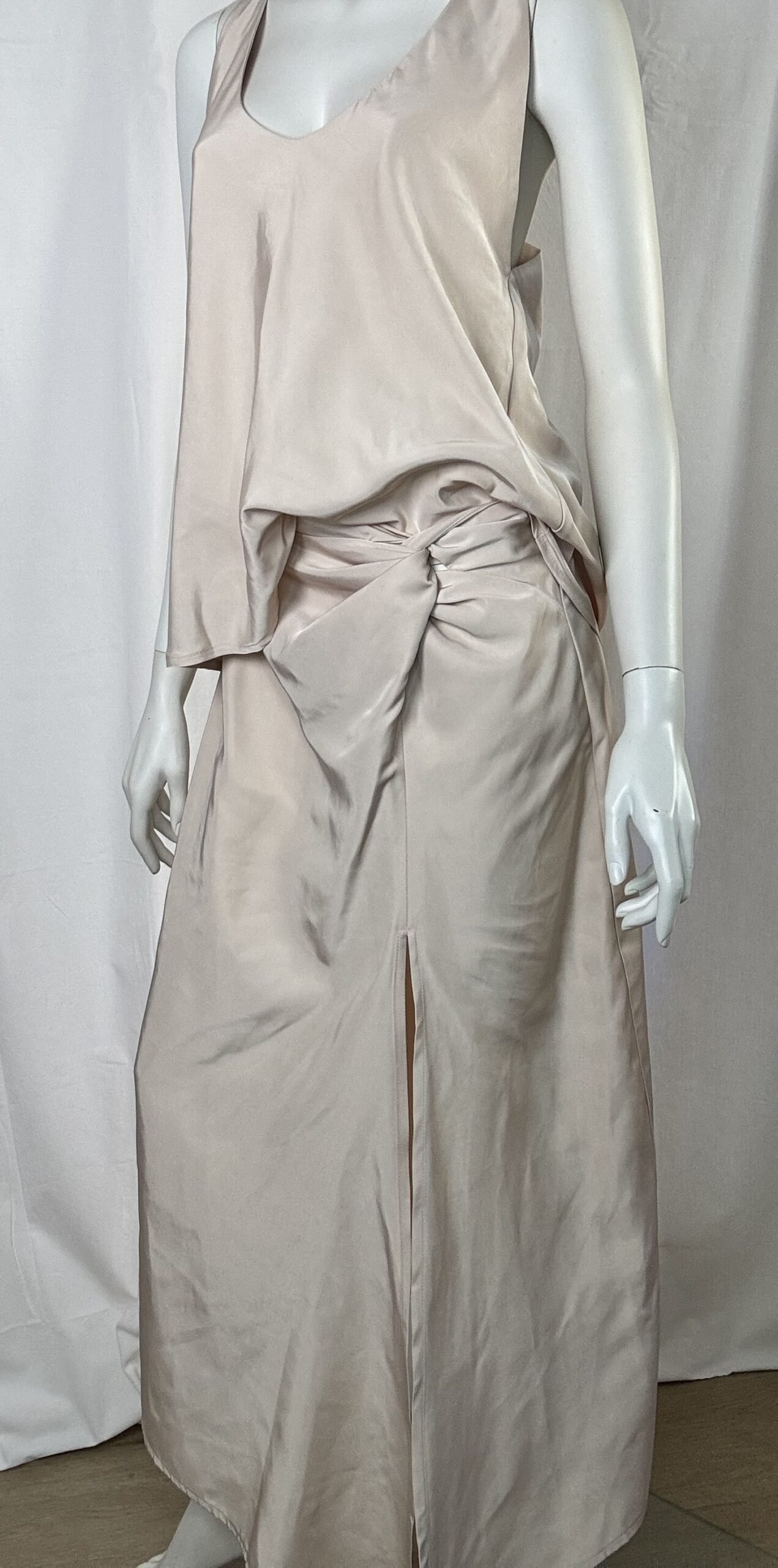 A sleek statement by ckontova, this wrap midi skirt is designed to tie at the waist and drape fluidly over the body for a flattering, adjustable fit. Crafted in a smooth satin-like fabric, it features a sculptural side knot and a bold front slit that adds movement and modern allure. Wear it with the matching top for an elevated evening set, or style it with a crisp shirt and heels for refined occasion dressing.