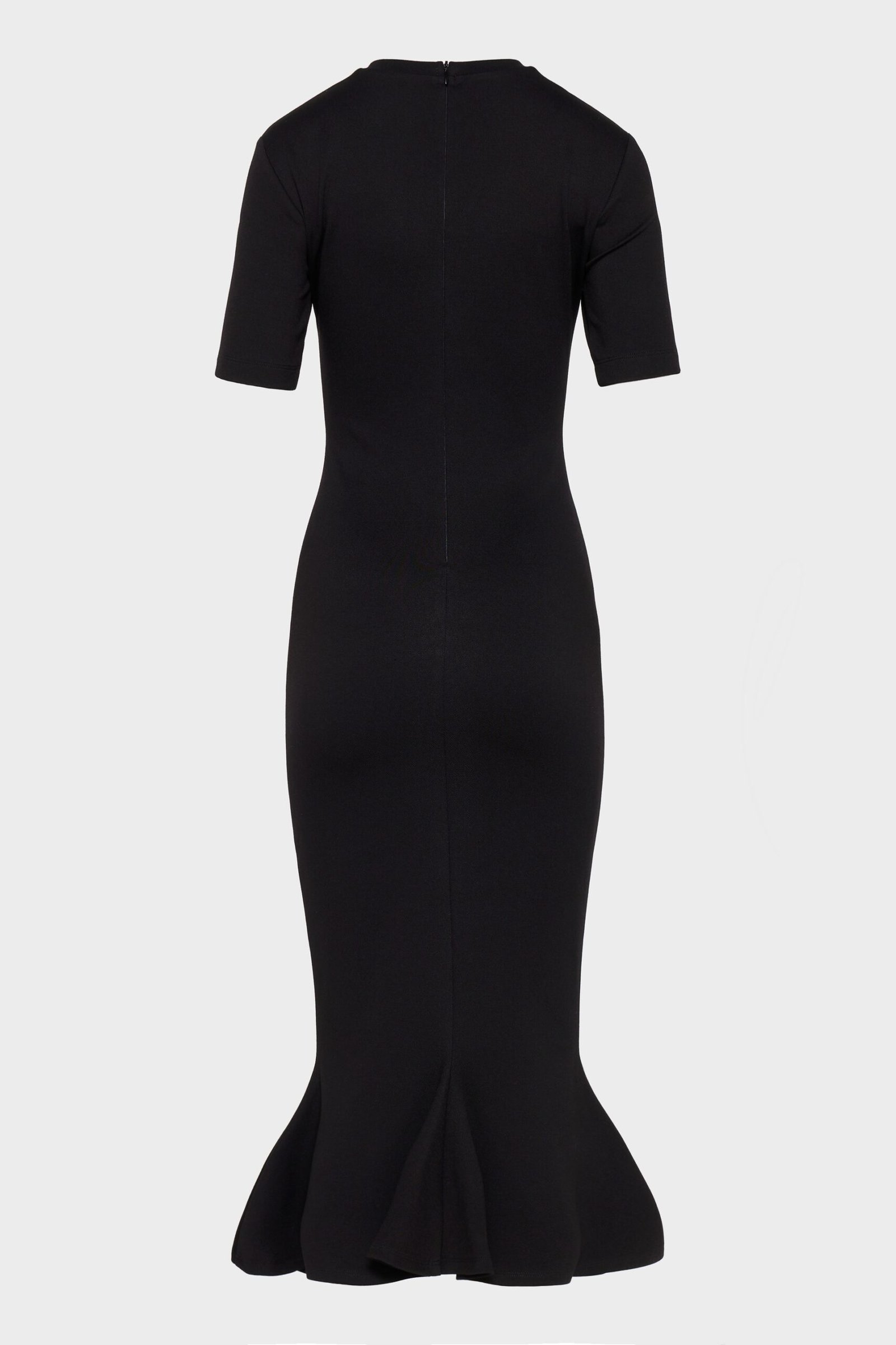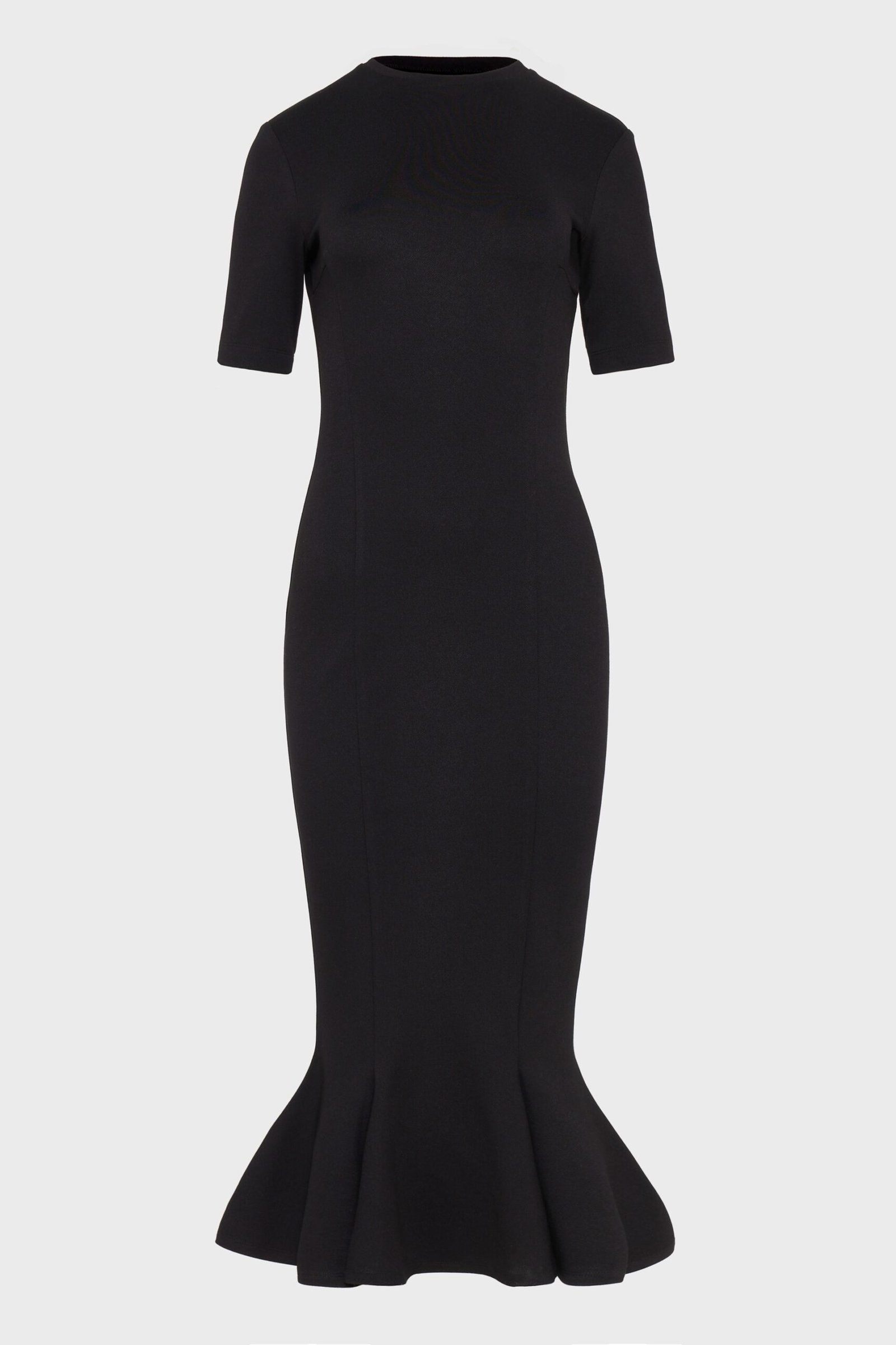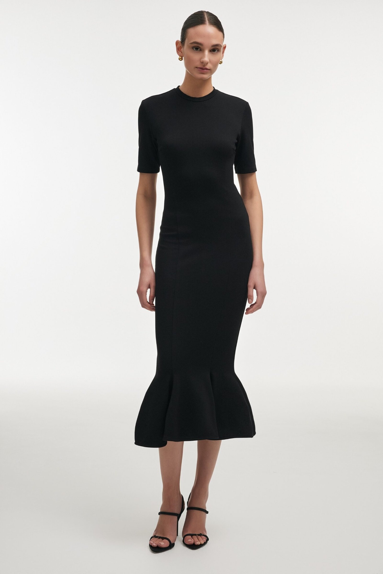 A fluid dress defined by line and motion.Cut close through the body and released softly at the hem, allowing the silhouette to unfold with each step. Crafted from diagonal jersey, the fabric drapes naturally while maintaining a controlled fit. Short sleeves and a clean neckline frame the upper body with restraint, balancing softness with clarity. Designed to be worn with ease and intention.