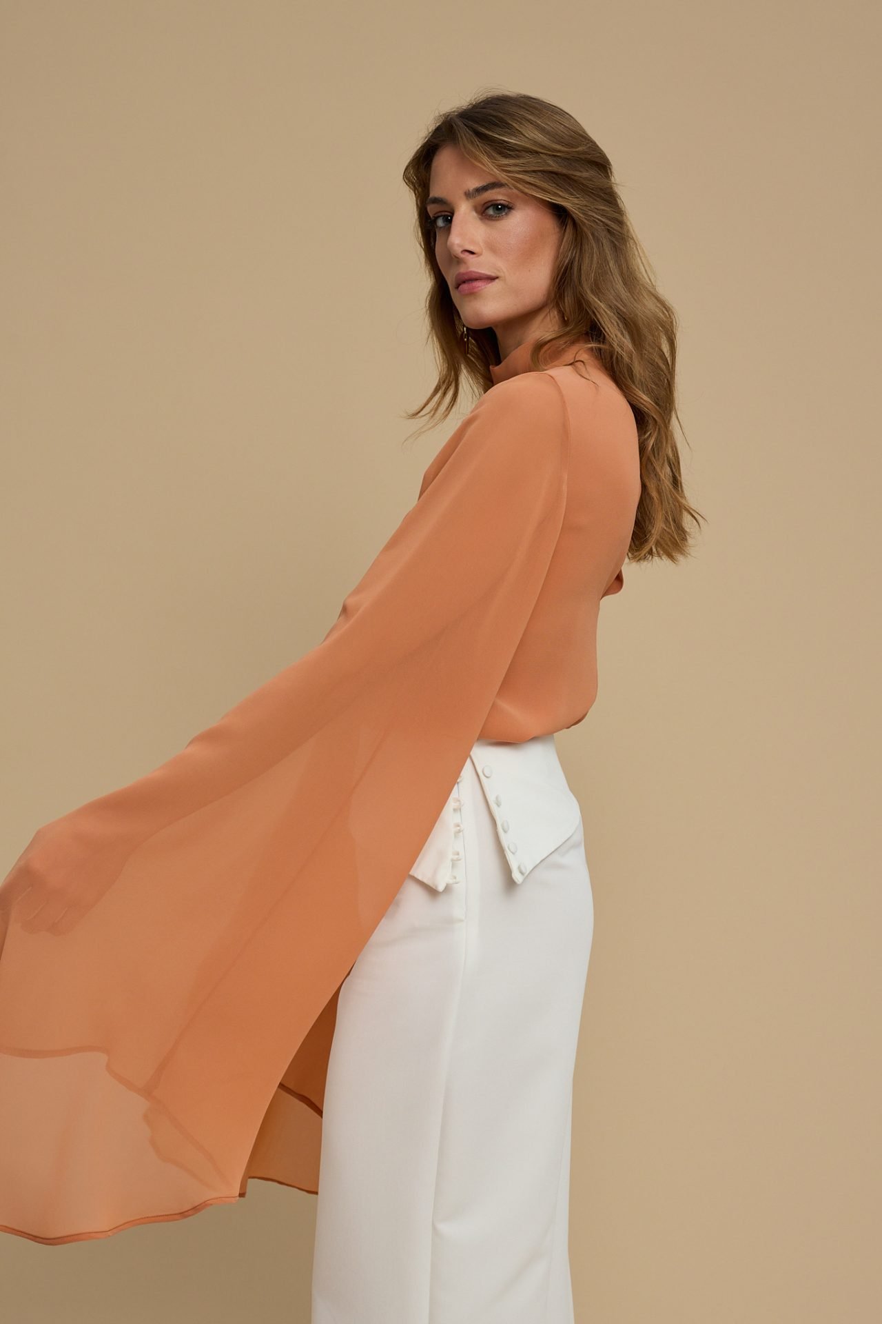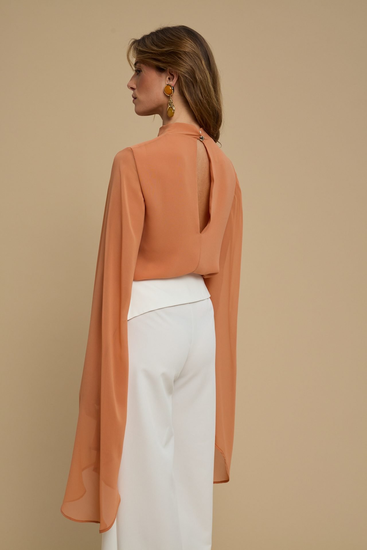 A fluid top designed with dramatic cascading sleeves.
