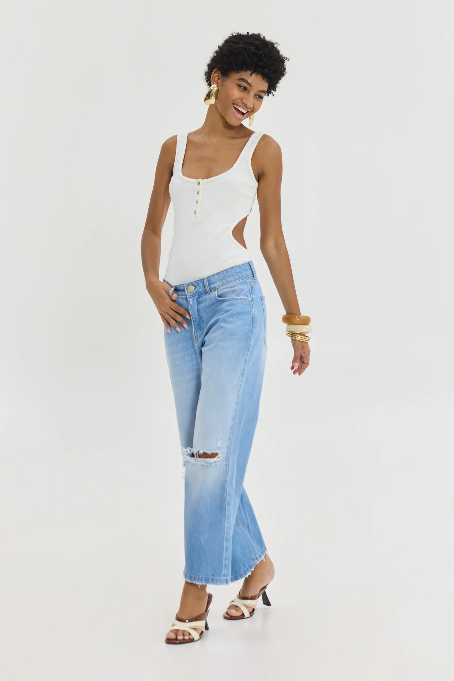 • Denim παντελόνι με σκίσιμο στο γόνατο και ξέφτια