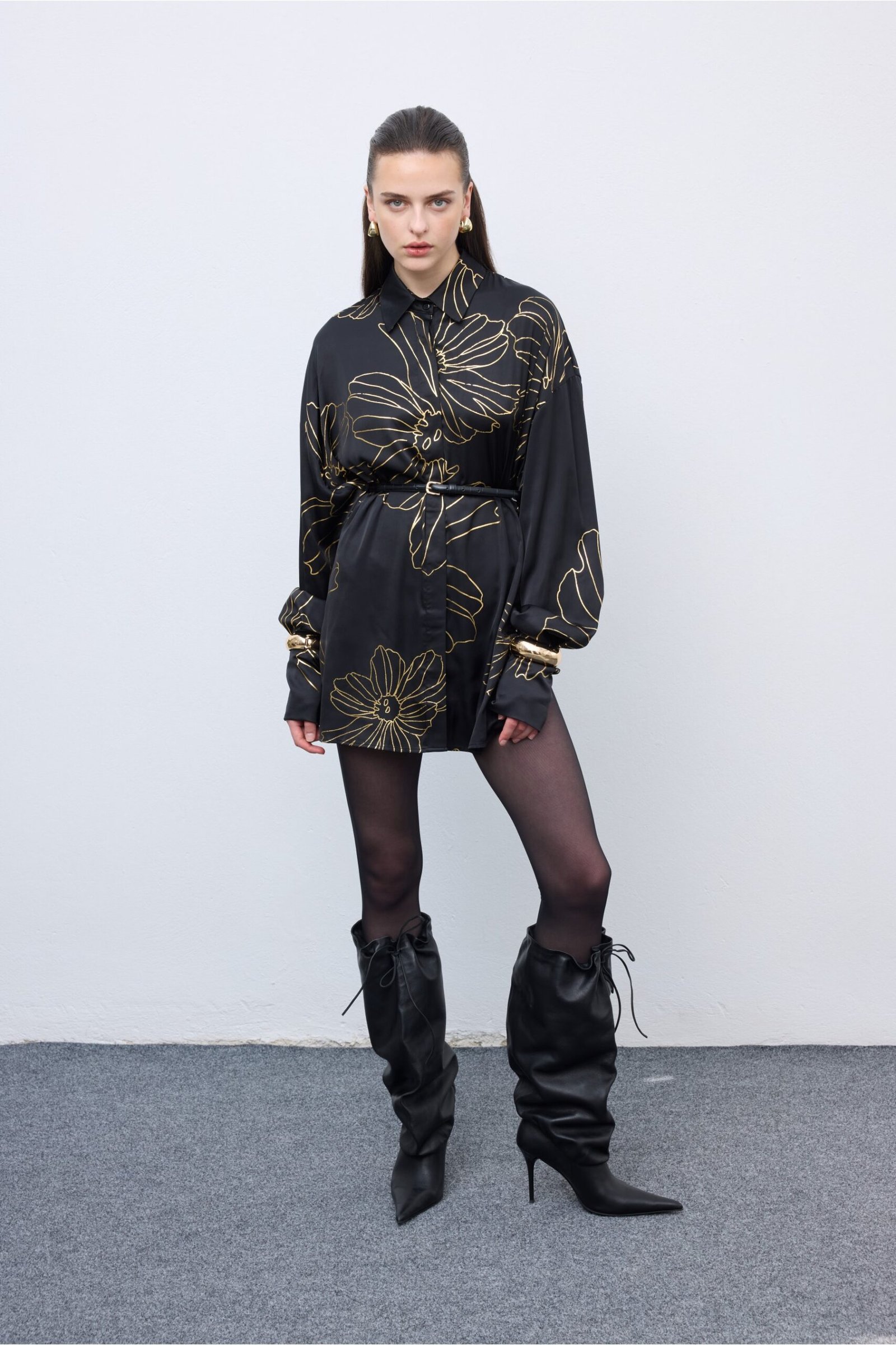 Elevate your wardrobe with this effortlessly chic oversized shirt, featuring a bold floral line print. Crafted from lightweight, silky fabric, it drapes beautifully for a relaxed yet refined silhouette. The soft structure, voluminous sleeves, and minimalist collar add a touch of modern sophistication, while the monochrome palette ensures timeless appeal. Style it belted for definition or wear it loose for a more laid-back look.