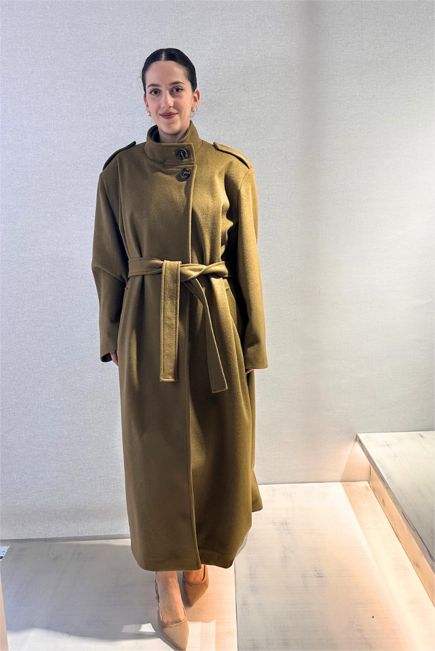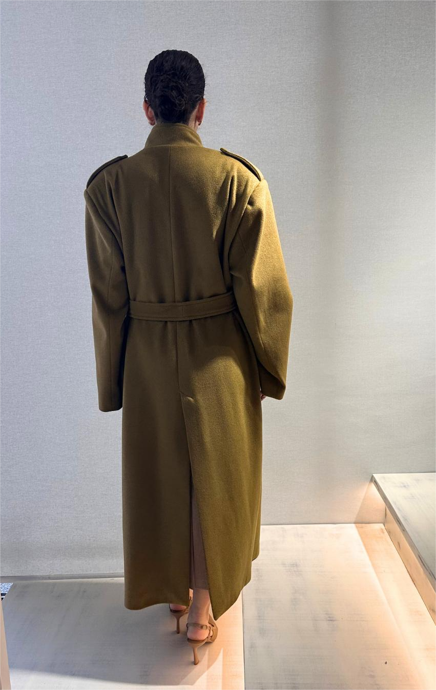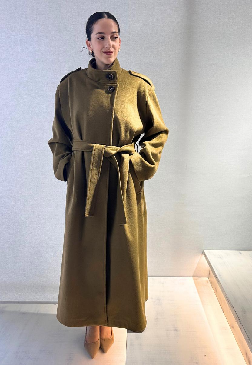 A statement coat that manages to be relevant wherever you go, this khaki long coat will make you look like a streetstyle fashion star. It closes with belt, highlighting the waist and making a flattering line, while has a high neck for extra style. A staple, that is also a fashion proposal.