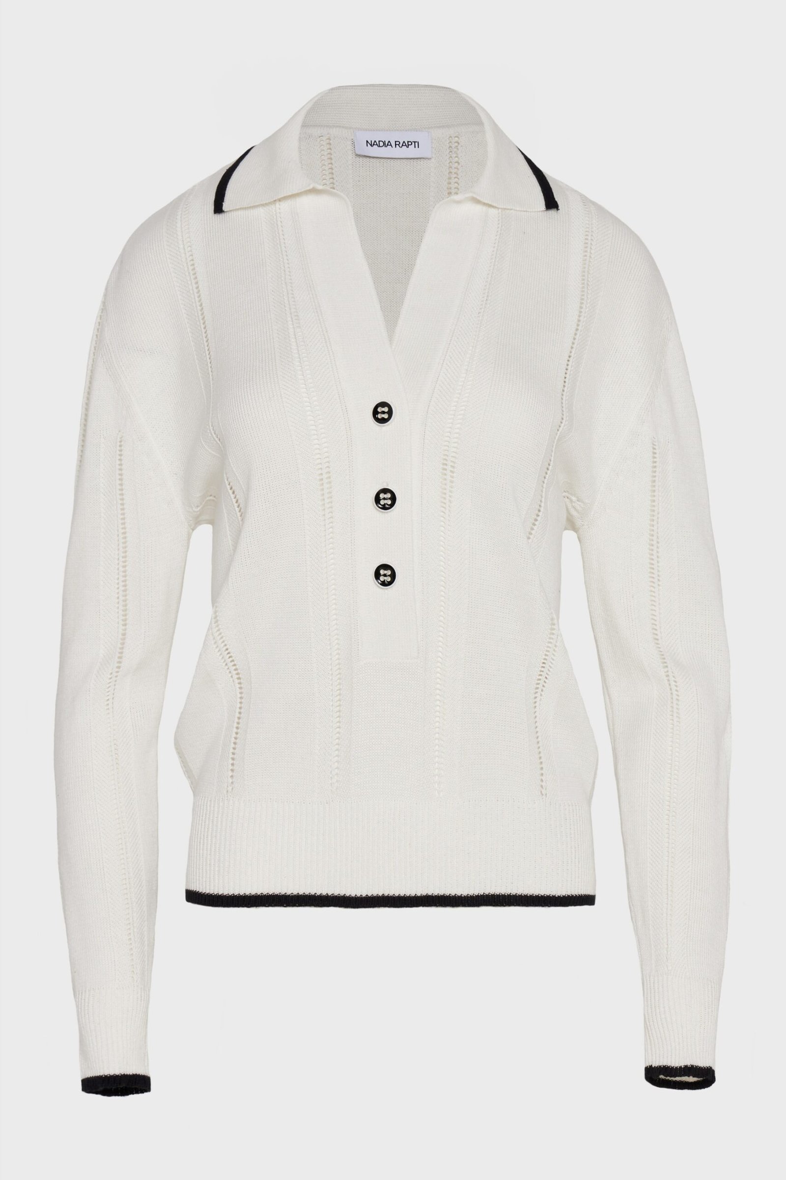 A structured knitted blouse that blends classic tailoring with modern femininity. Designed with a sharp collar, deep neckline, and button-down front, it creates a defined silhouette while maintaining softness through its knit construction.