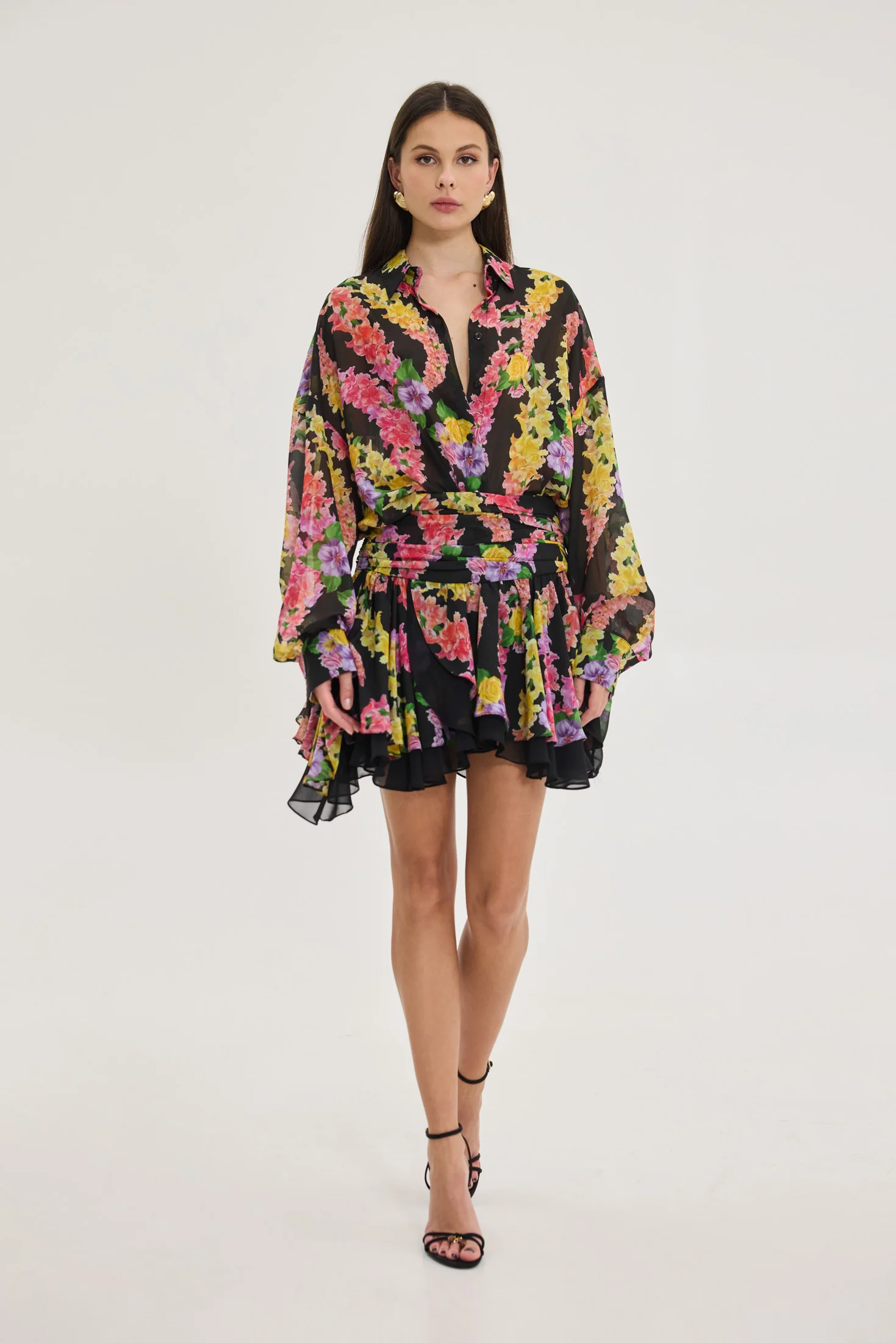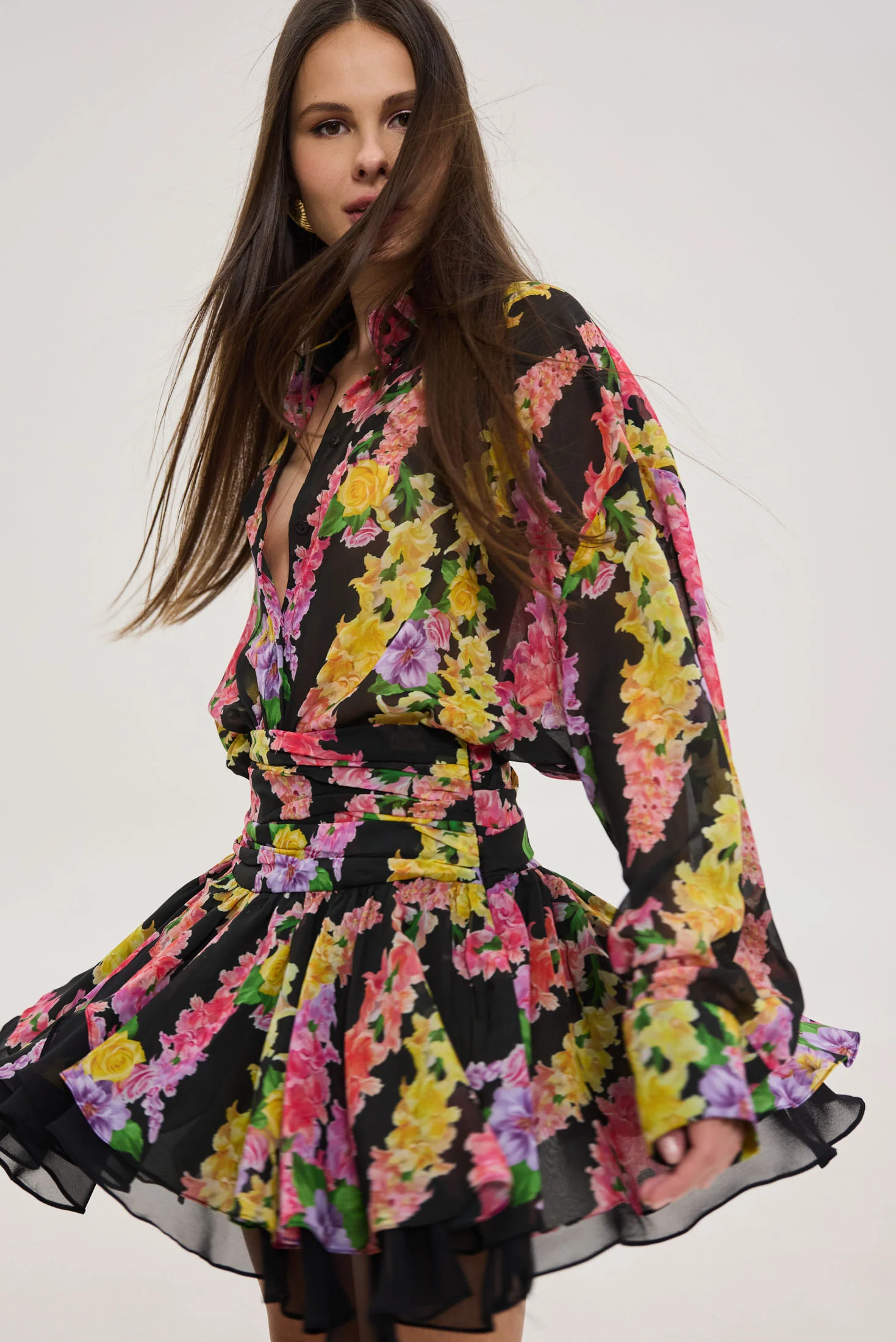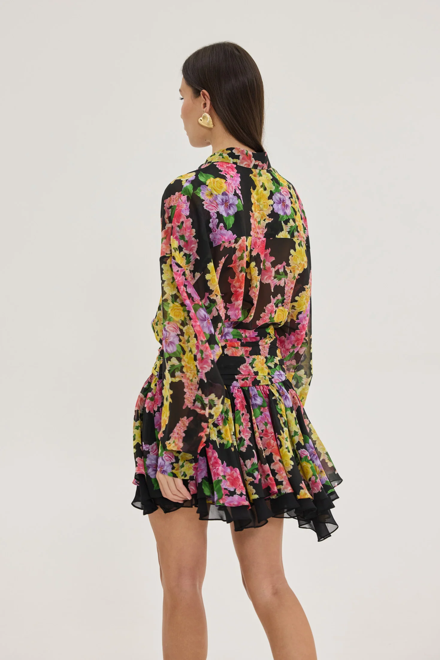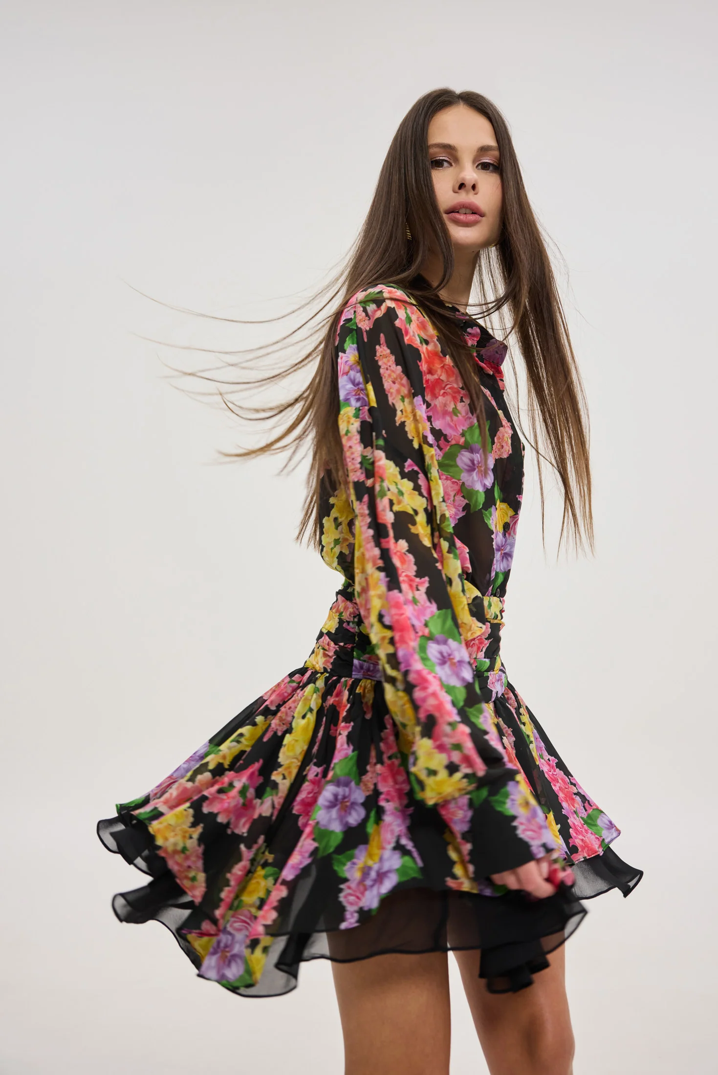 • Ασύμμετρη φούστα με βολάν και εσωτερική φόδρα σε μαύρο χρώμα που φαίνεται στην κίνηση