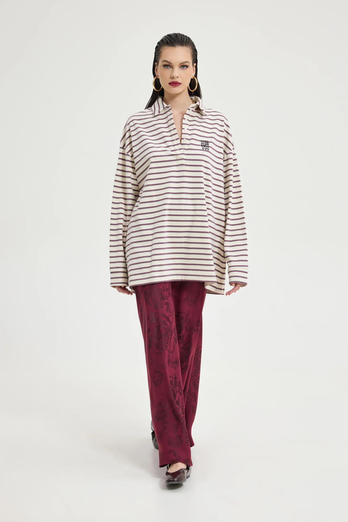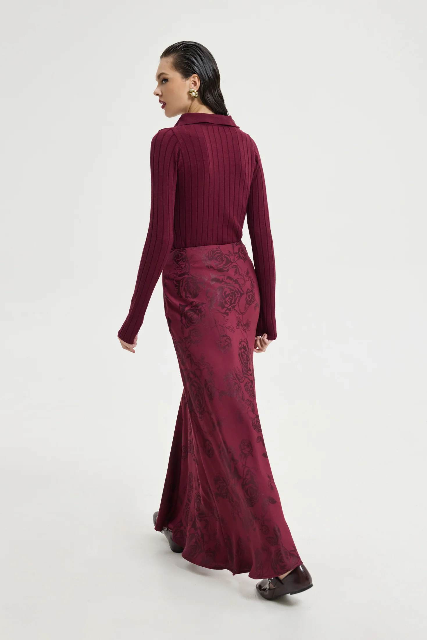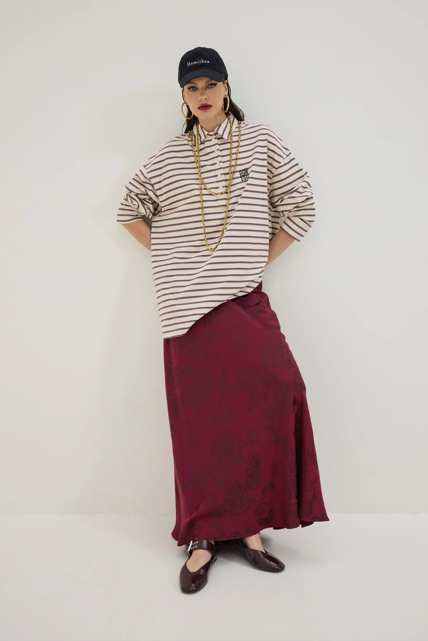 Τι είναι η Jacquard σατέν βισκόζη και γιατί προσπαθήσαμε τόσο να πετύχουμε τον τέλειο συνδυασμό; Είναι το πιο μαλακό και δροσερό ύφασμα που θα φορέσεις κι εμείς τη φτιάξαμε με το δικό μας print σε tone to tone bordeaux). Πολλές προσπάθειες για το “τέλειο” χρώμα και την ισορροπία.