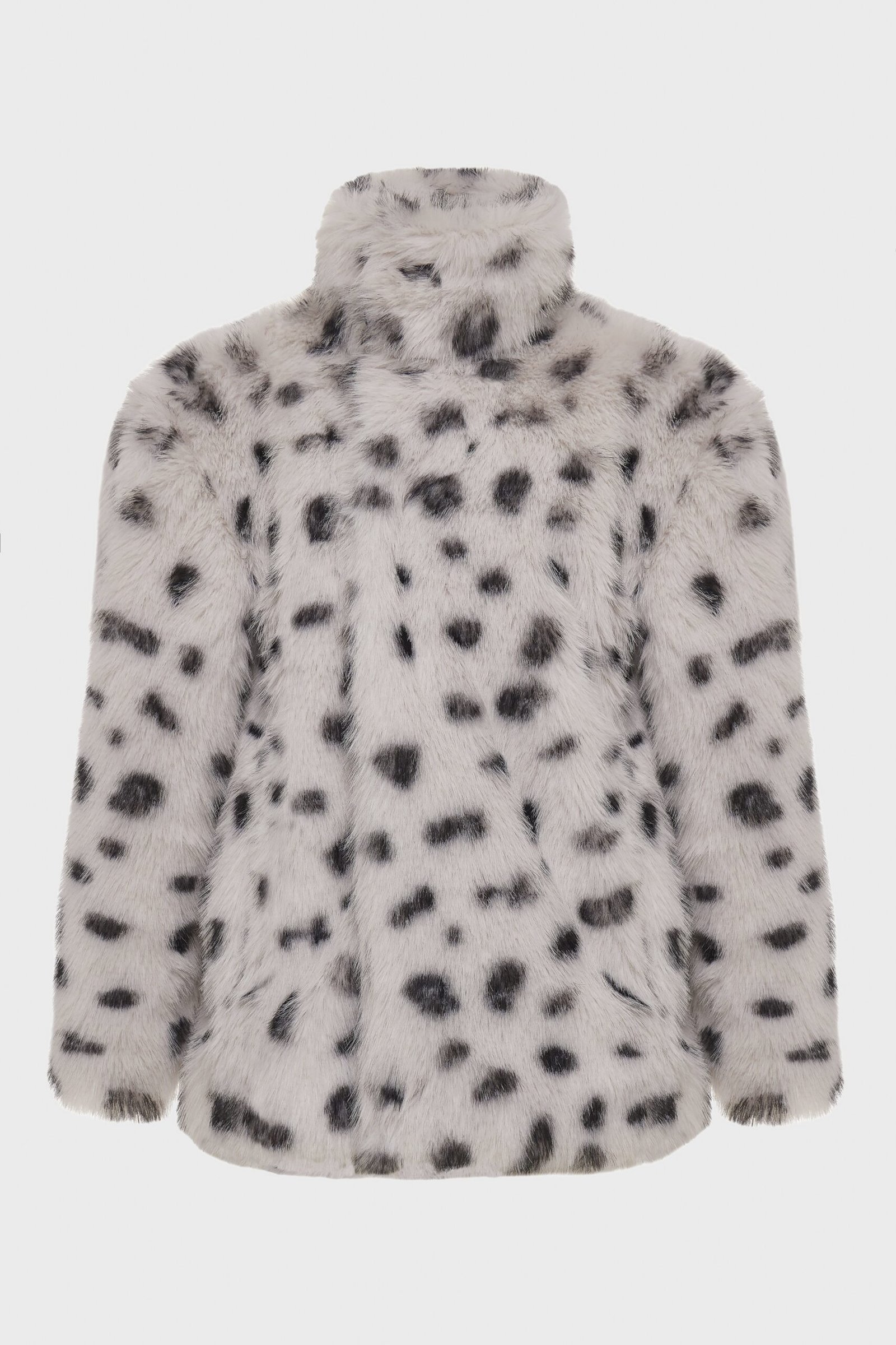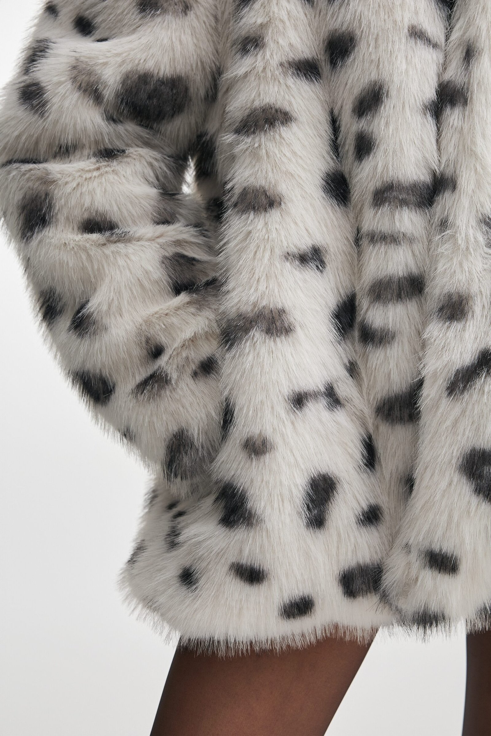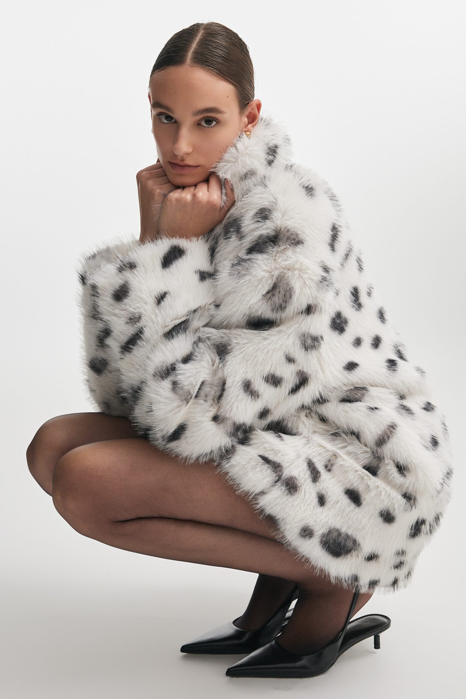 A plush faux fur coat with a clean, modern line. White base, scattered black markings, a subtle yet playful print.