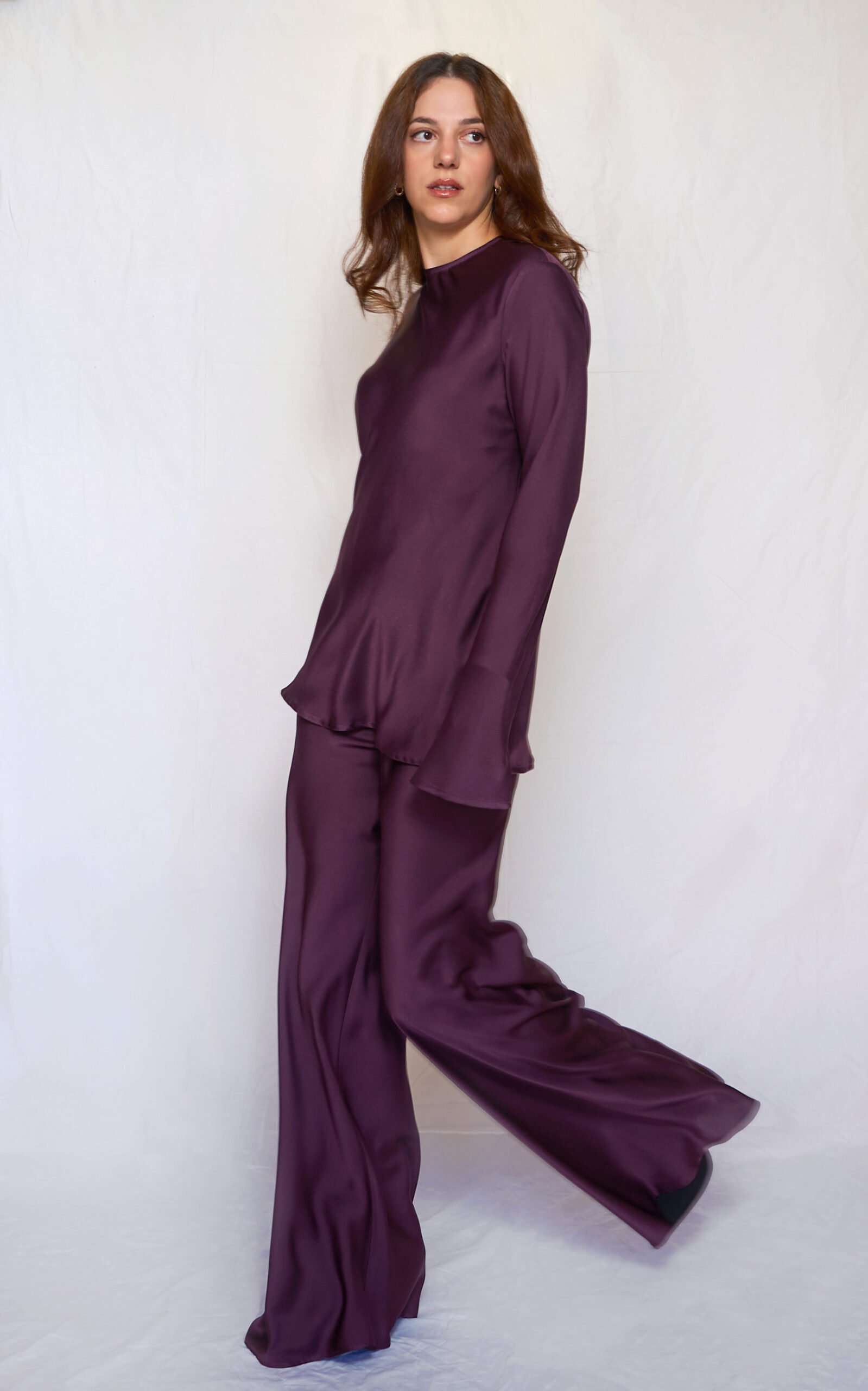 A fluid silhouette and timeless elegance define these wide-leg satin pants by ckontova. Designed with a high waist and soft pleats, they offer a flattering drape and polished flow with every step. Crafted from lightweight, glossy satin fabric, they pair perfectly with coordinating tops for an effortless statement look, from office wear to evening outings.