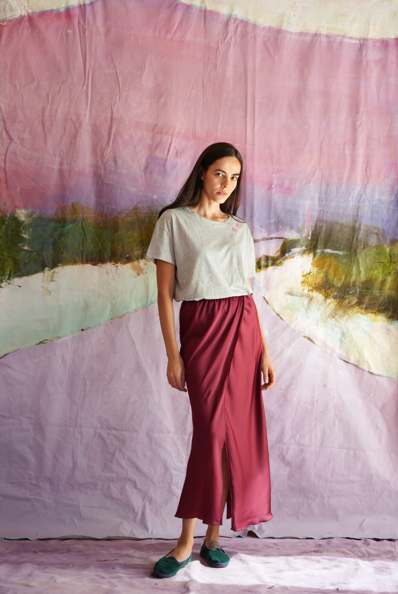 Midi ψηλόμεση satin φούστα με δύο ανοίγματα, ένα στο μπροστά μέρος και ένα πίσω.