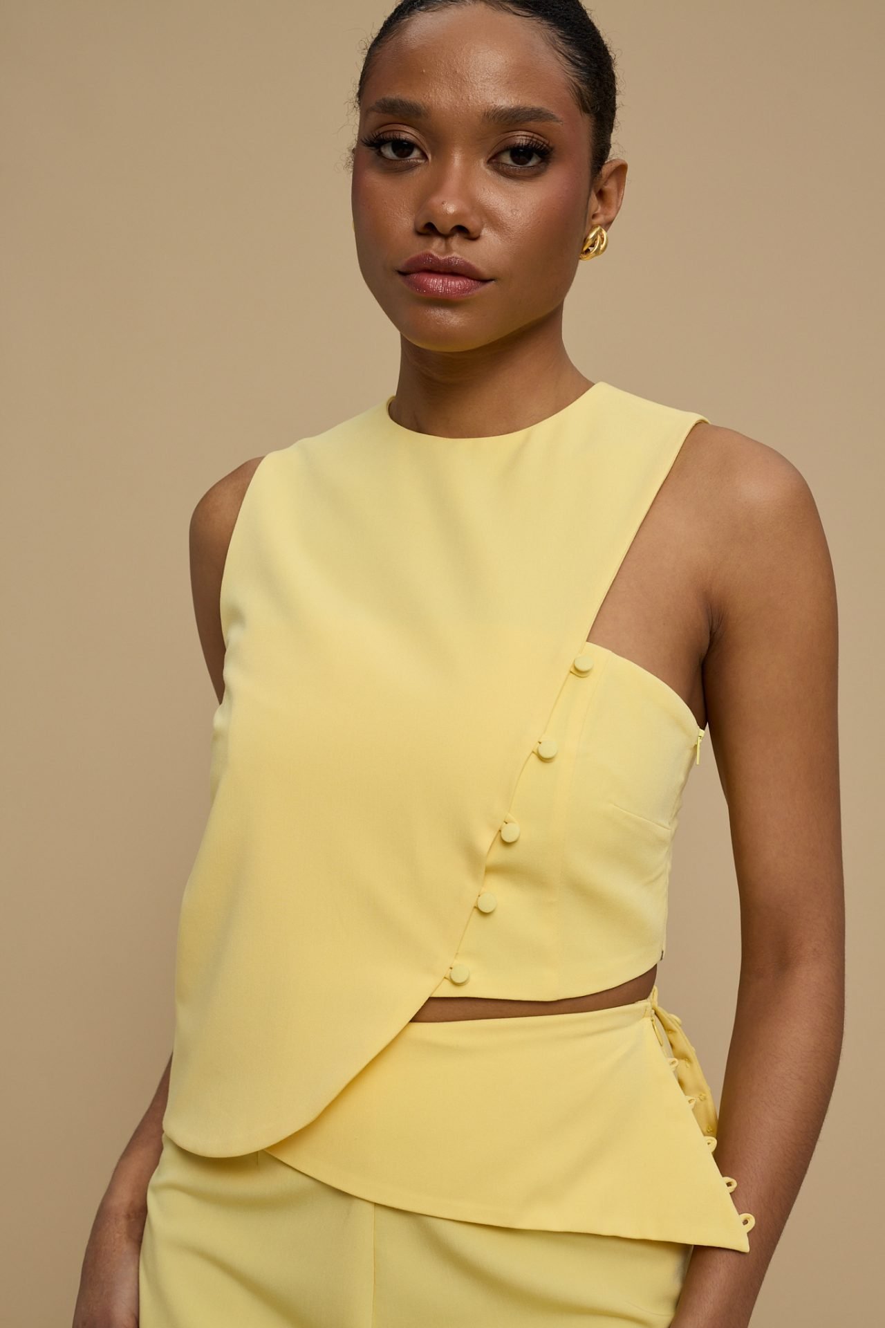 An asymmetrical top resembling a corset design, with an asymmetrical hem and side cutout.