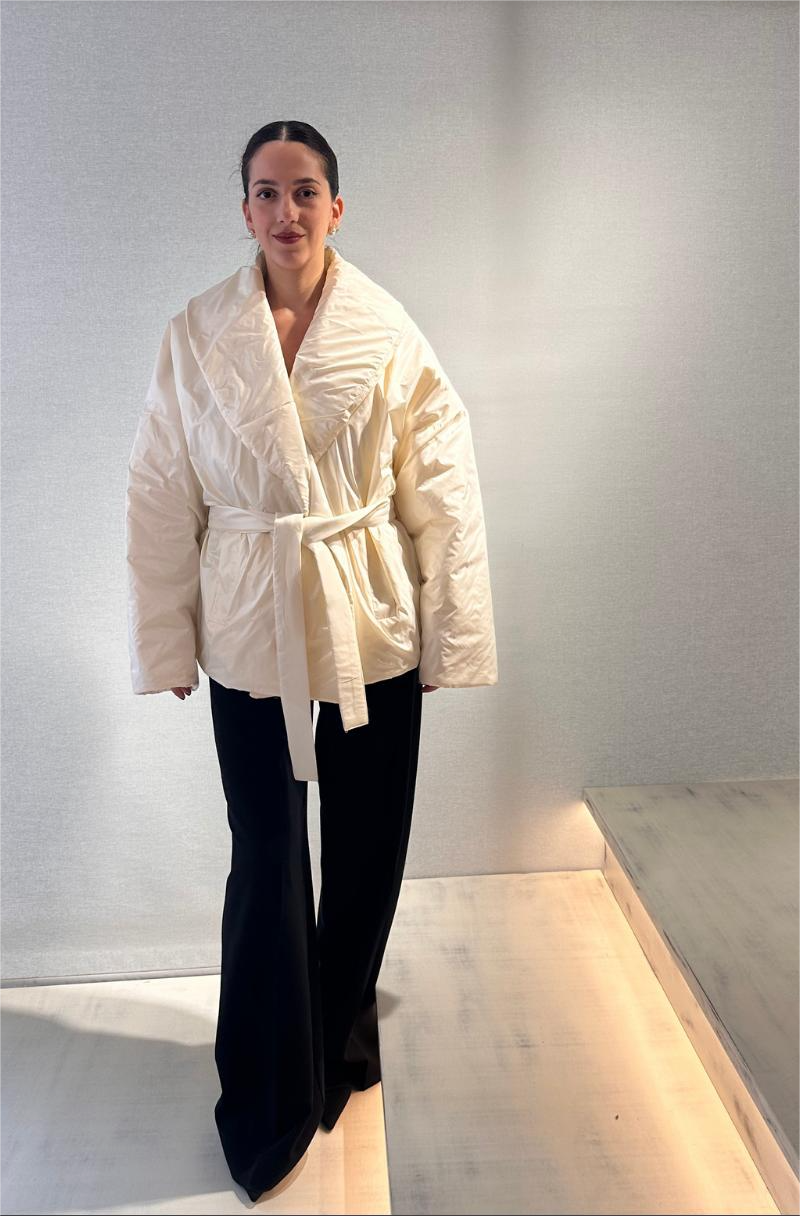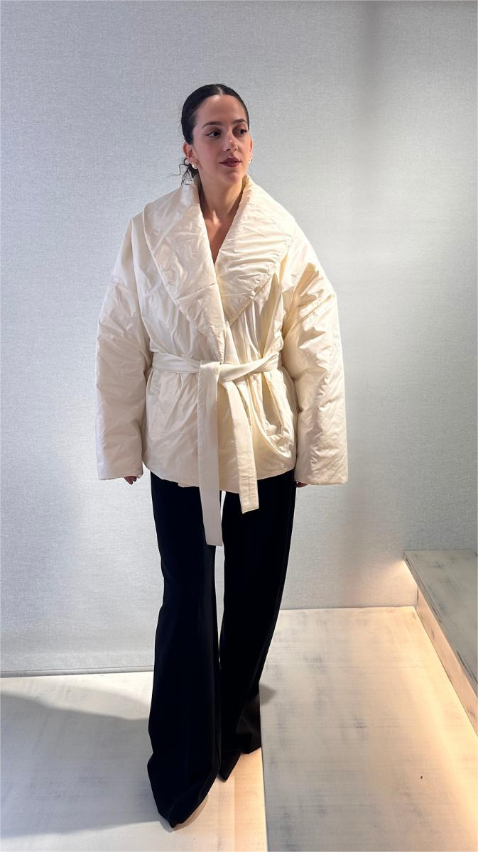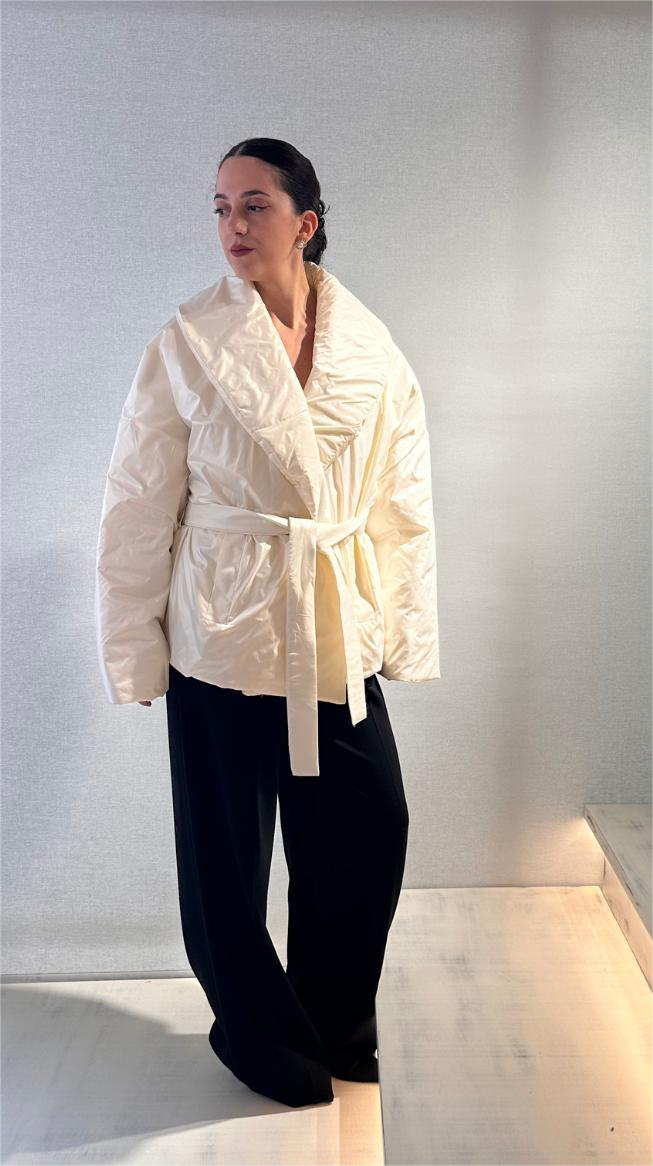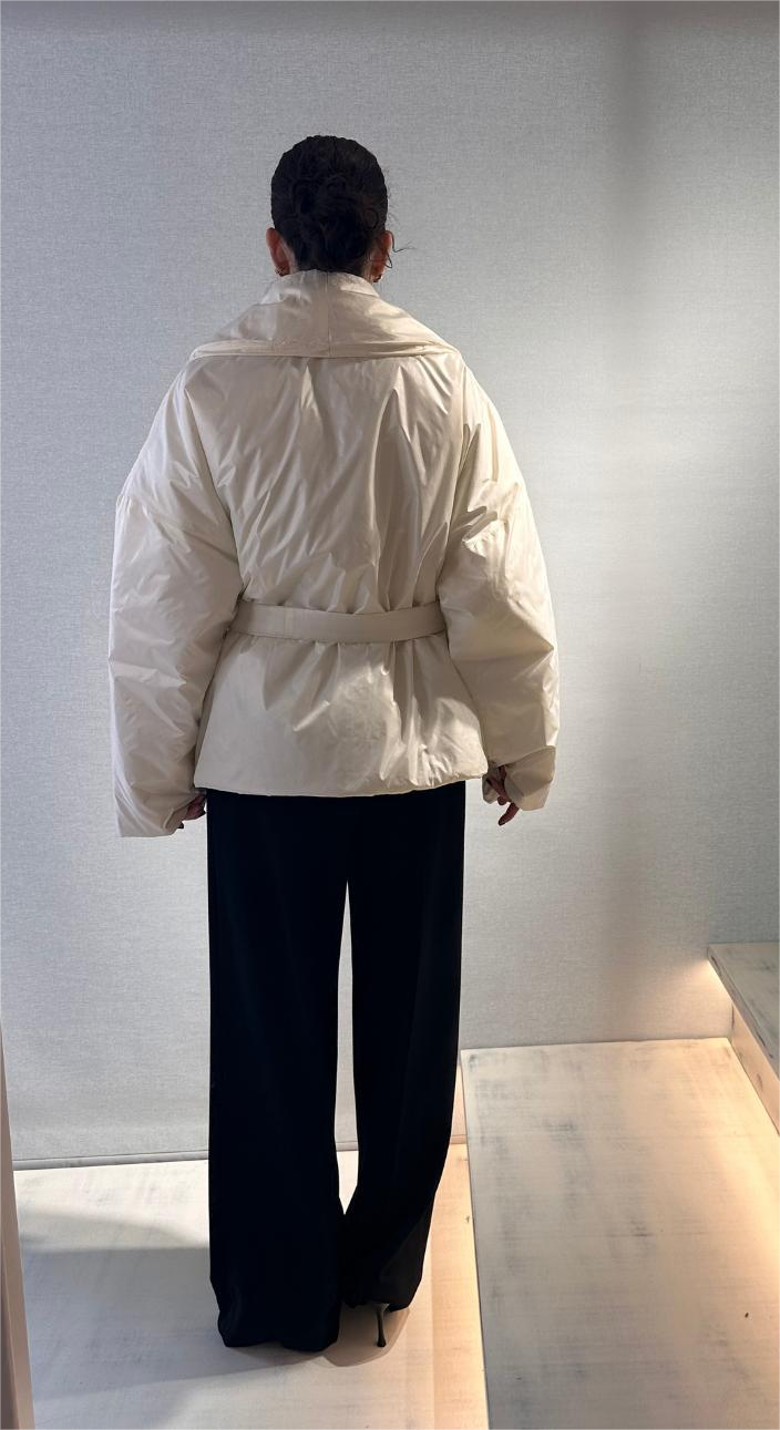 This oversized white puffer jacket by ckontova is the perfect fusion of warmth and elevated design. Crafted with a glossy finish and wrapped in a soft, voluminous silhouette, it features a shawl collar and a detachable fabric belt that cinches the waist for a flattering shape. Ideal for both city strolls and winter getaways, this statement outerwear piece adds instant sophistication to your cold-weather looks.