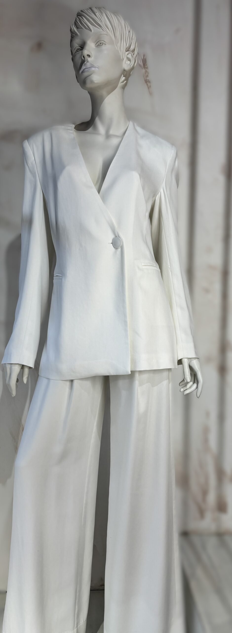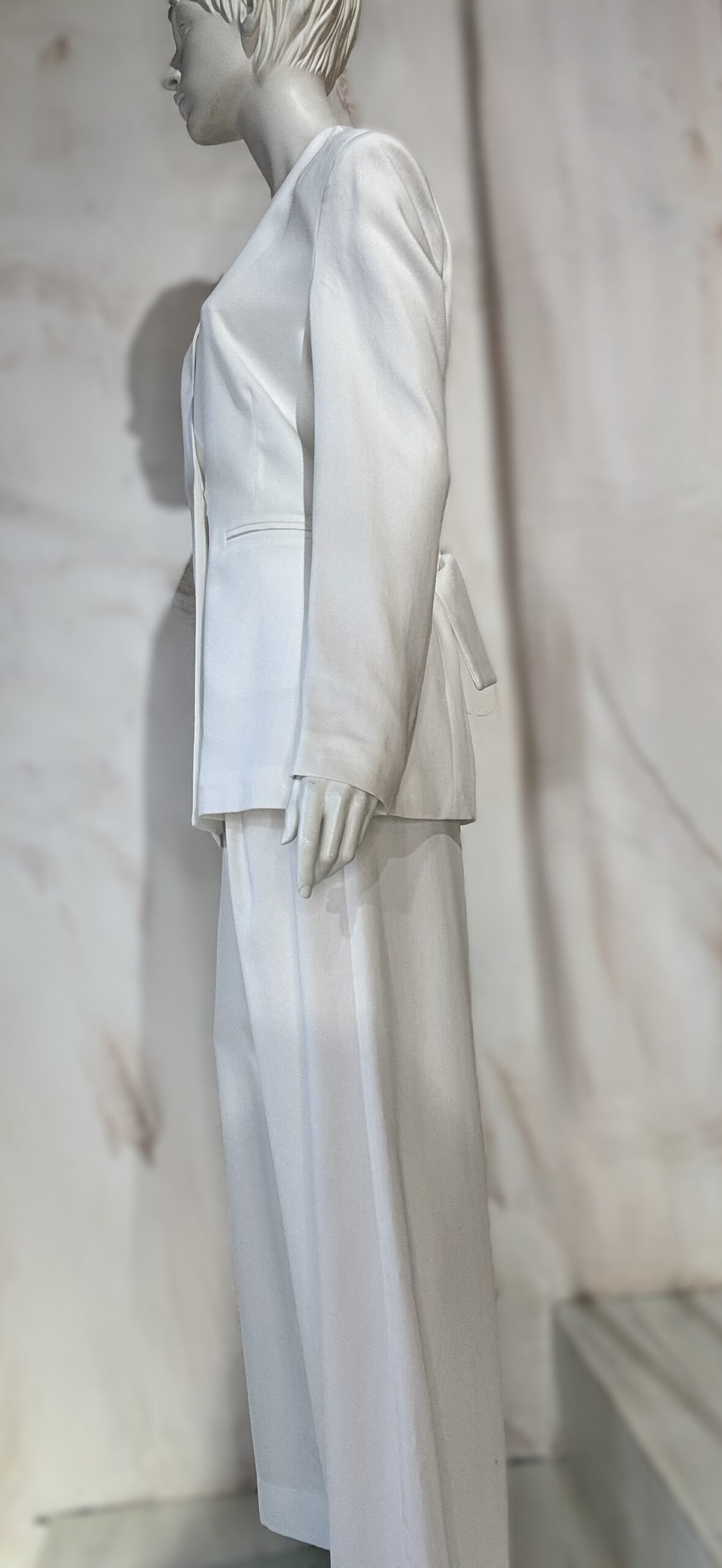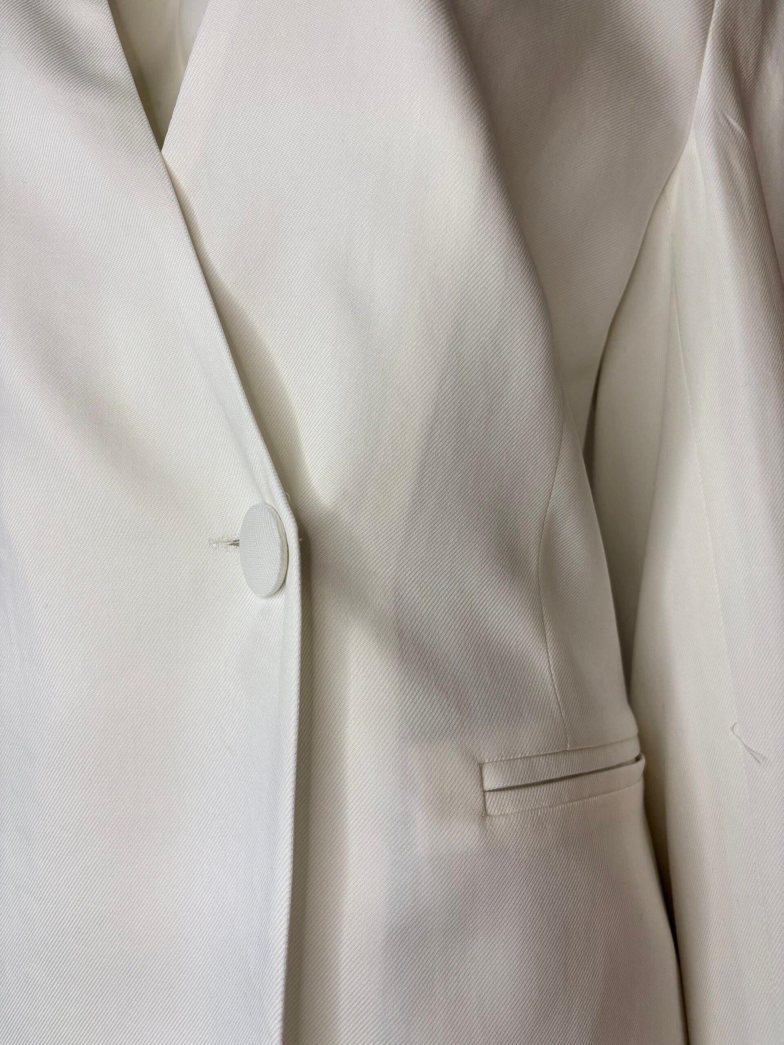 A refined statement blazer by ckontova, designed with strong shoulders and a sleek single-button front for a clean, elongated silhouette. The deep V neckline creates a modern, minimalist line, while the back belt detail subtly defines the waist for a flattering shape. Finished with discreet welt pockets, it’s the perfect piece for contemporary suiting, wear it with the matching trousers for an all-white power set, or layer it over a slip dress for elevated evening styling.
