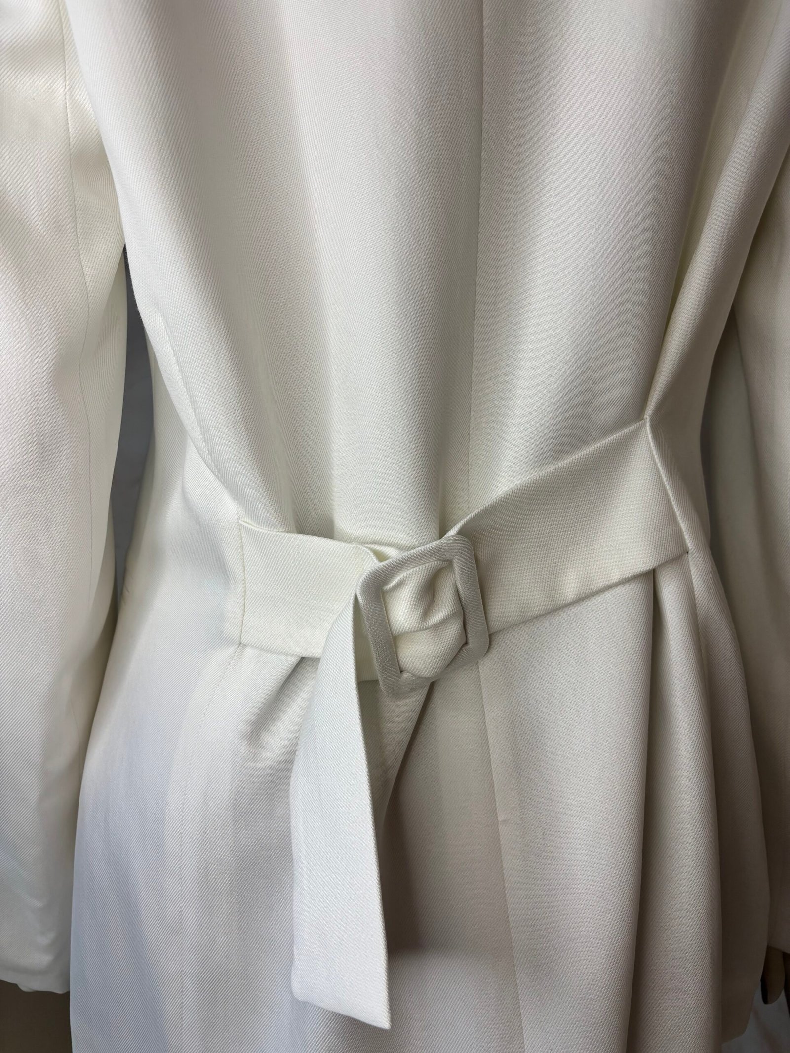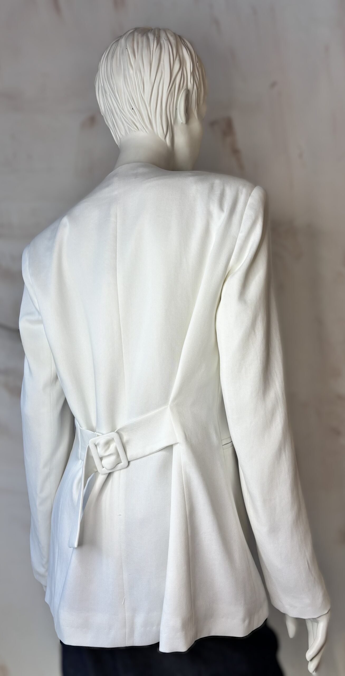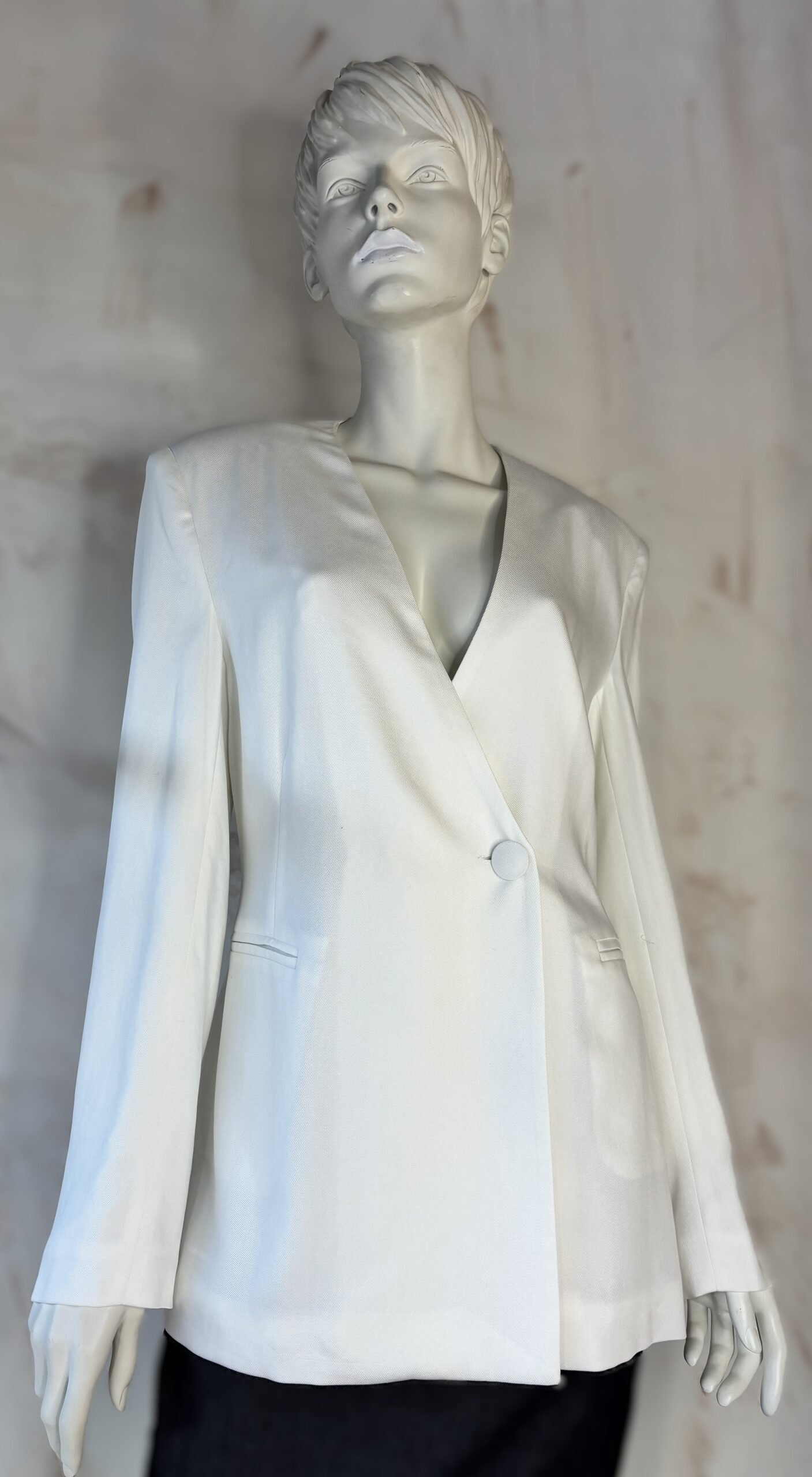 A refined statement blazer by ckontova, designed with strong shoulders and a sleek single-button front for a clean, elongated silhouette. The deep V neckline creates a modern, minimalist line, while the back belt detail subtly defines the waist for a flattering shape. Finished with discreet welt pockets, it’s the perfect piece for contemporary suiting, wear it with the matching trousers for an all-white power set, or layer it over a slip dress for elevated evening styling.