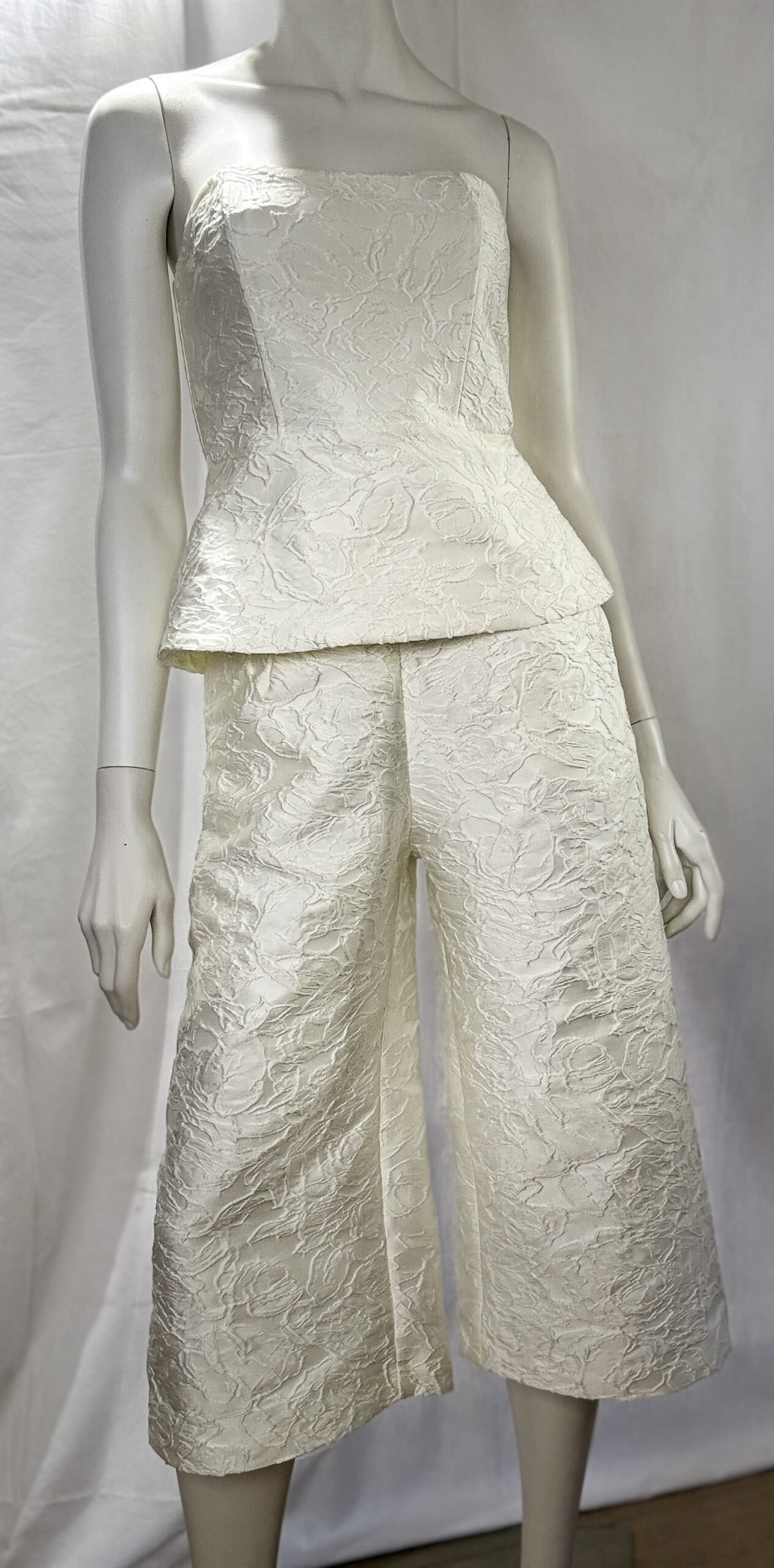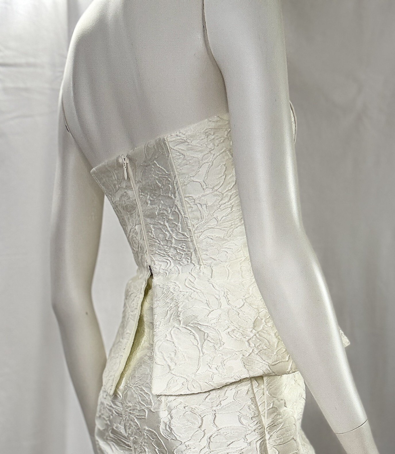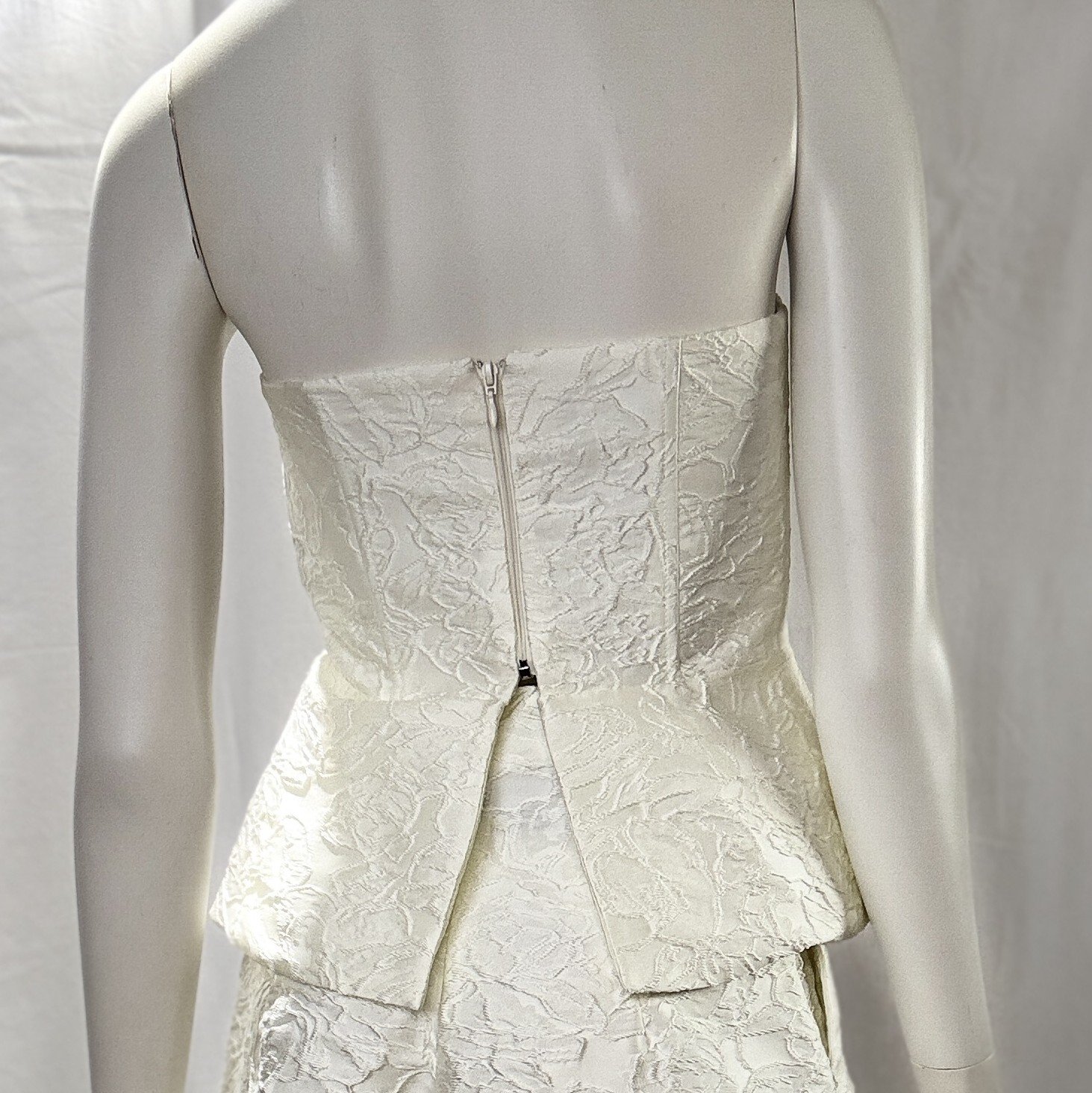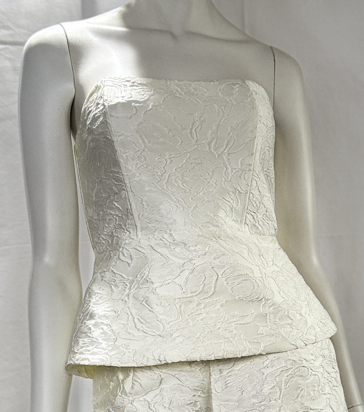 A statement ckontova bustier designed to sculpt the silhouette with modern elegance. Featuring a strapless neckline and structured seaming, it’s crafted in a rich tonal jacquard with an abstract floral texture that adds depth and a subtle sheen. The fitted bodice flares into a peplum-style hem for a flattering waist definition. Wear it with the matching trousers for a striking evening set, or style it with a sleek skirt for elevated occasion dressing.