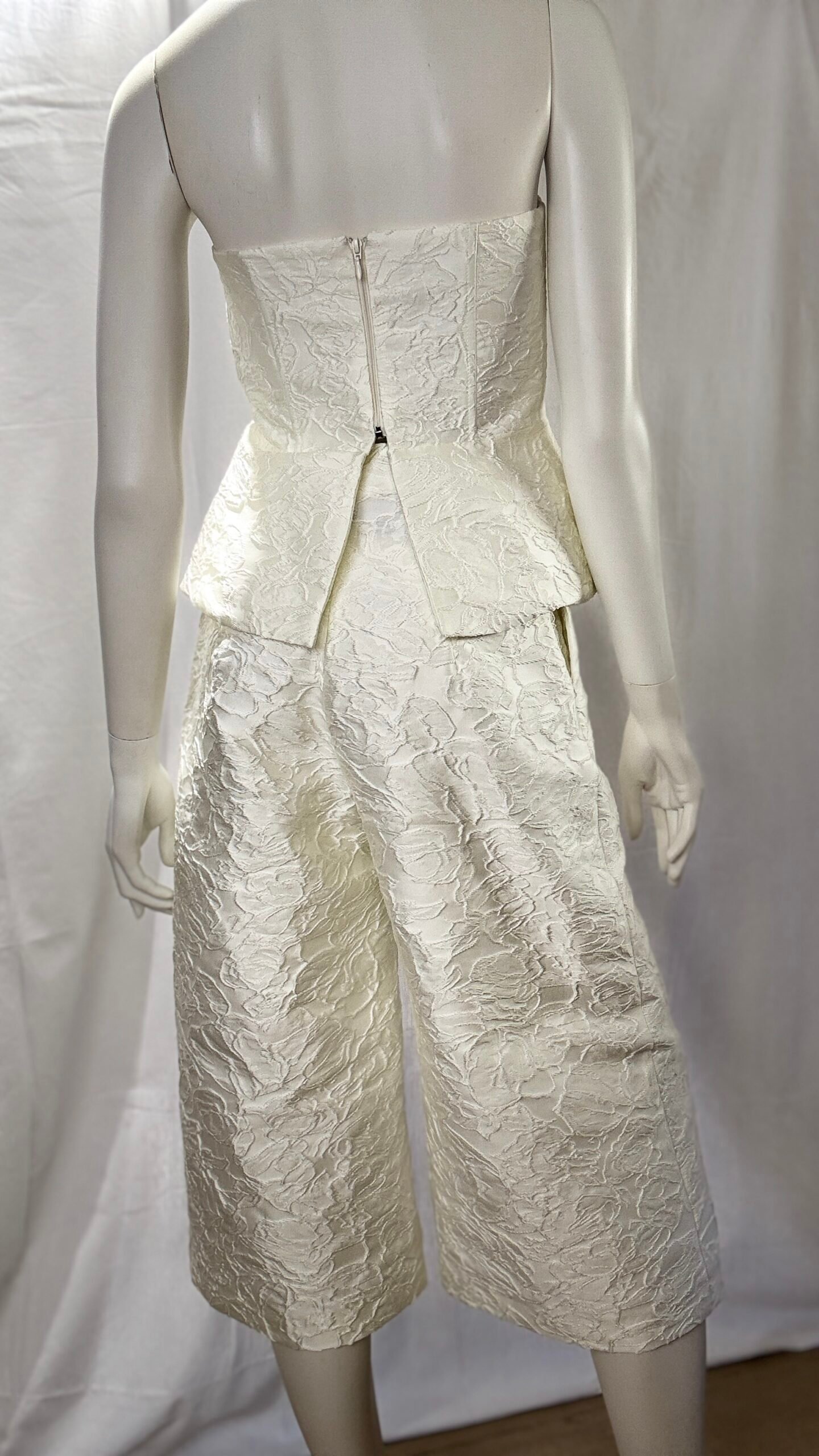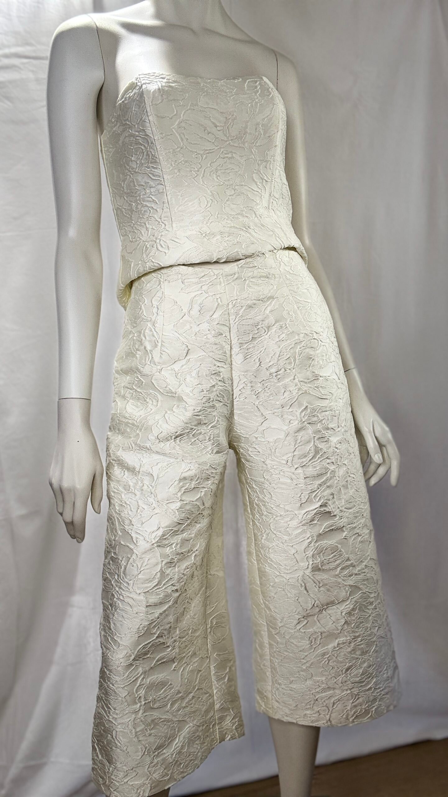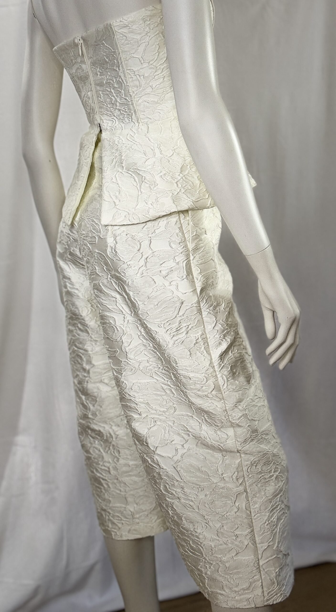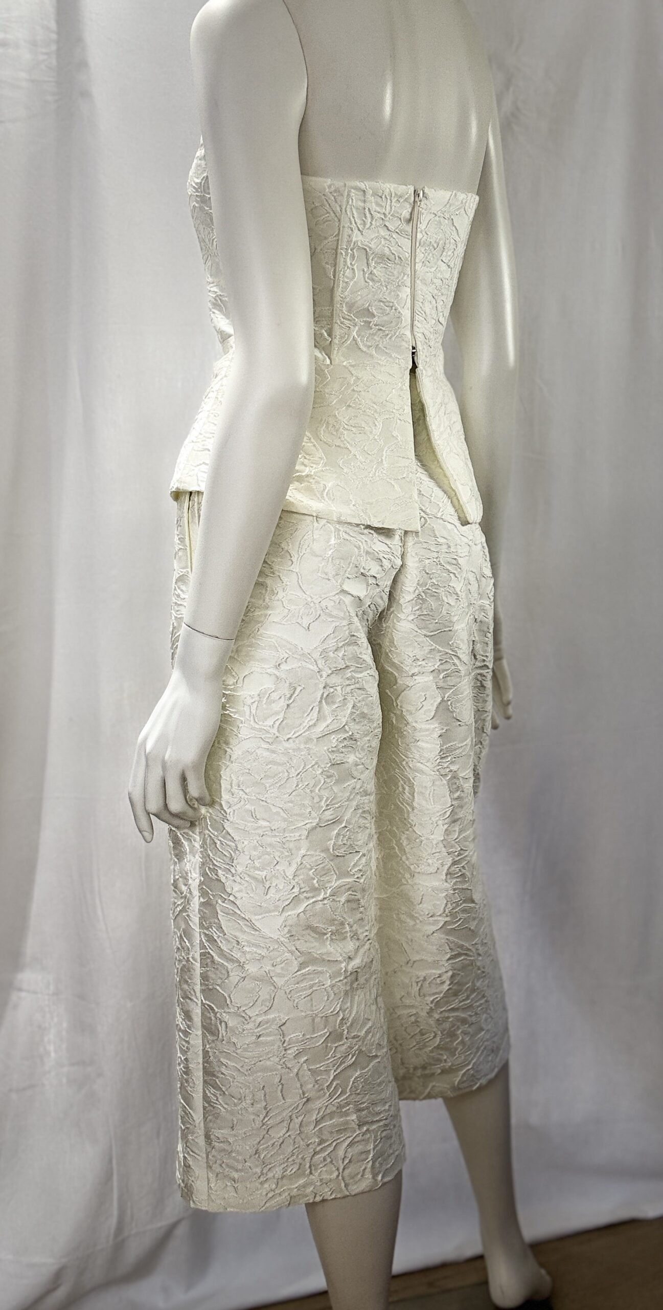 A modern occasion staple by ckontova, these ivory culottes are cut in a wide-leg cropped silhouette for an elegant, effortless line. Crafted in a textured jacquard with an abstract floral motif, they catch the light with a subtle sheen while keeping a clean, refined finish. The structured waistband sits neatly on the waist, and the soft volume through the leg adds movement and comfort. Wear them with the matching strapless bustier for a striking set, or pair with a crisp shirt for contemporary minimalism.