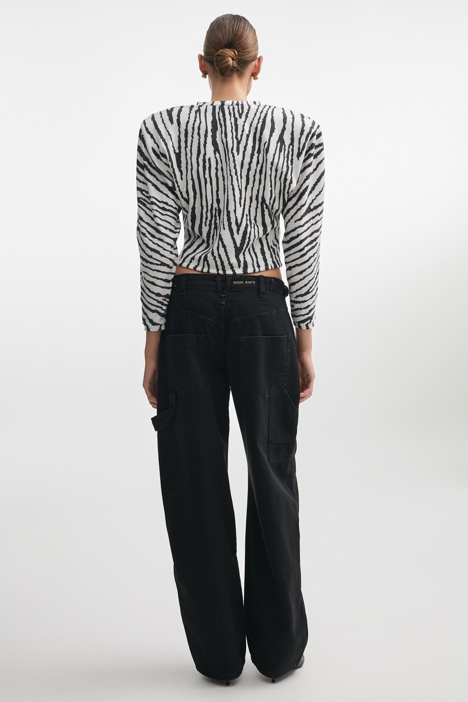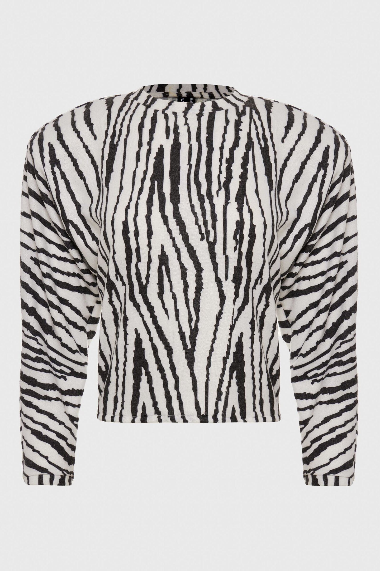 A bold zebra-print blouse designed for confident, standout styling. Crafted from a heavy jersey fabric, it offers a structured yet comfortable fit that flatters the silhouette. The striking monochrome pattern brings a modern, fashion-forward edge,perfect for elevating everyday looks or making a statement after dark.