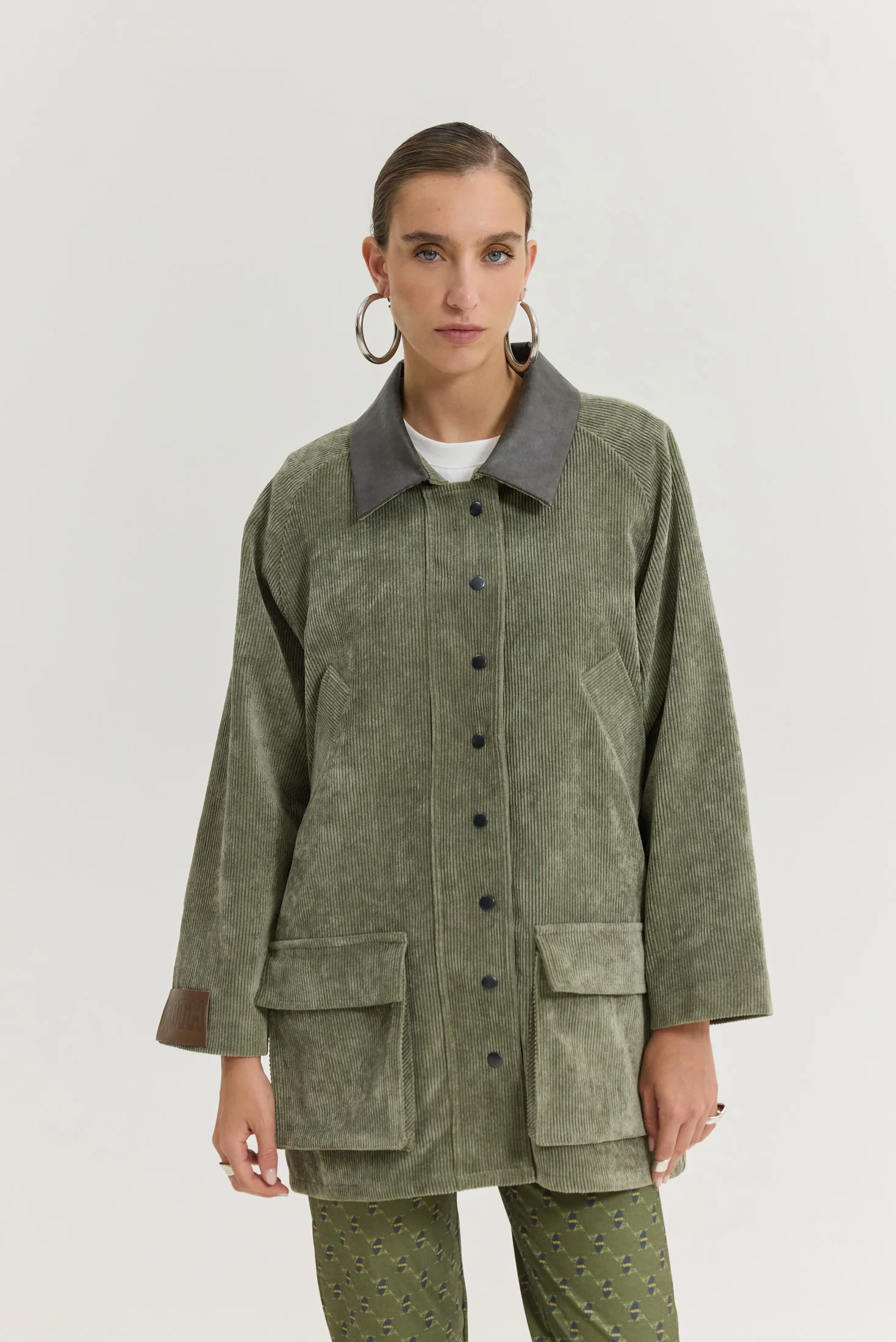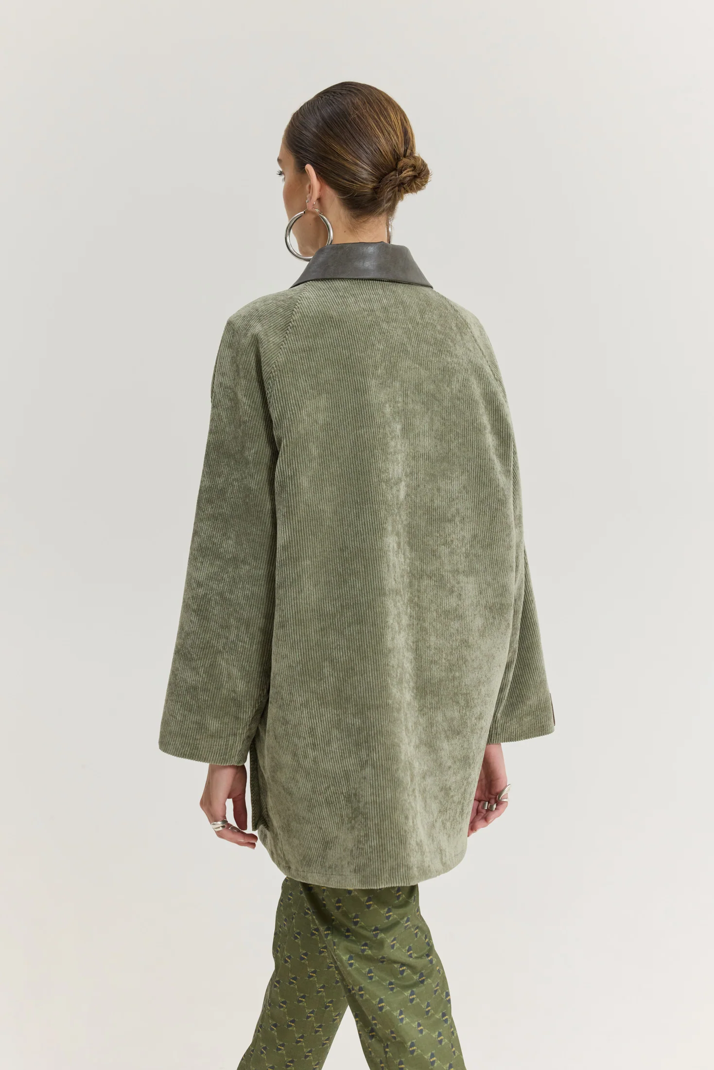 • Κοτλέ ύφασμα με faux leather γιακά σε χακί χρώμα